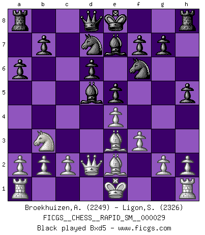 Last move : 0-1 2025 June 6 17:44:26 [Event "FICGS__CHESS__RAPID_SM__000029"] [Site "FICGS"] [Date "2025.03.23"] [Round "1"] [White "Broekhuizen,A. T. S."] [Black "Ligon,Scott"] [Result "0-1"] [WhiteElo "2249"] [BlackElo "2326"] 1.e4 c5 2.Nf3 d6 3.d4 cxd4 4.Nxd4 Nf6 5.Nc3 a6 6.f3 e5 7.Nb3 Be6 8.Be3 Be7 9.Qd2 h5 10.Be2 Nbd7 11.Nd5 Bxd5 12.exd5 Qc7 13.c4 a5 14.a4 h4 15.Rg1 Nh5 16.Bf1 b6 17.O-O-O b5 18.axb5 a4 19.Na1 a3 20.b3 a2 21.Kb2 f5 22.g4 hxg3 23.hxg3 Bf6 24.Nc2 Kf7 25.Ra1 e4 26.Bd4 Ne5 27.Be2 exf3 28.Bf1 Ng4 29.Bh3 Qa7 30.Bxg4 fxg4 0-1 Follow this game move after move (download)Chess opens and enriches your mind. (Saudin Robovic) Wenn es im Universum noch irgendwo intelligente Lebewesen gibt, dann kennen sie Go. (Emanuel Lasker) Personalmente, yo prefiero mirar hacia el futuro en donde un programa de computadora gane el título mundial de Ajedrez. La humanidad necesita una lección de humildad. (Richard Dawkings) Il (Jacob Murray) ne joue pas pour le bon coup, mais pour le meilleur. (Eloi Relange) I'll be back. (Arnold Schwarzenegger)