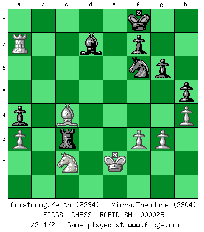 Last move : 1/2-1/2 2025 May 4 1:39:56 [Event "FICGS__CHESS__RAPID_SM__000029"] [Site "FICGS"] [Date "2025.03.23"] [Round "1"] [White "Armstrong,Keith"] [Black "Mirra,Theodore"] [Result "1/2-1/2"] [WhiteElo "2294"] [BlackElo "2304"] 1.Nf3 d5 2.d4 Nf6 3.c4 e6 4.g3 Bb4+ 5.Bd2 a5 6.Bg2 O-O 7.Qc2 c5 8.cxd5 cxd4 9.Nxd4 Qb6 10.e3 exd5 11.a3 Bxd2+ 12.Nxd2 Nc6 13.N2f3 Bg4 14.O-O Rfc8 15.Qd3 h5 16.Rab1 Qa6 17.Rfd1 Nxd4 18.Qxd4 Rc4 19.Qd3 g6 20.Ra1 Rc7 21.h3 Qxd3 22.Rxd3 Bd7 23.Nd4 Rac8 24.h4 Kg7 25.f3 Ne8 26.Kf2 b5 27.Rd2 Nd6 28.Bf1 Nc4 29.Rc2 a4 30.Re1 Rb7 31.e4 dxe4 32.Rxe4 Rcb8 33.Bd3 Nd6 34.Re5 b4 35.Ra5 bxa3 36.bxa3 Ne8 37.Be4 Rb2 38.Ra7 Nf6 39.Bd3 R2b6 40.Bc4 Rc8 41.Bd3 Rxc2+ 42.Nxc2 Rb3 43.Ke2 Kf8 44.Bc4 Rc3 45.Bd3 Rb3 46.Bc4 Rc3 1/2-1/2 Follow this game move after move (download)Morphy was probably the greatest genius of them all. (Bobby Fischer) Gewöhnliche Menschen denken nur daran, wie sie ihre Zeit verbringen. Ein intelligenter Mensch versucht, sie auszunutzen. (Arthur Schopenhauer) ¿Se han dado cuenta de que Fischer casi nunca ha tenido piezas malas? El las intercambia y las piezas malas se quedan con sus oponenets. (Yuri Balashov) On croit qu'il y a plus de mauvais joueurs que de bons joueurs, c'est faux : Il y a autant de joueurs qui gagnent que de joueurs qui perdent. (Philippe Geluck) Philosophers use a language that is already deformed as though by shoes that are too tight. (Ludwig Wittgenstein)