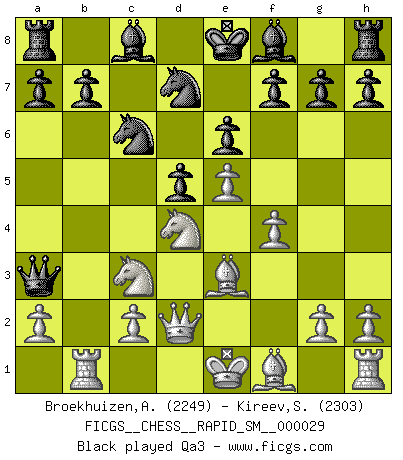 Last move : 1/2-1/2 2025 May 31 11:40:40 [Event "FICGS__CHESS__RAPID_SM__000029"] [Site "FICGS"] [Date "2025.03.23"] [Round "1"] [White "Broekhuizen,A. T. S."] [Black "Kireev,Sergey"] [Result "1/2-1/2"] [WhiteElo "2249"] [BlackElo "2303"] 1.e4 e6 2.d4 d5 3.Nc3 Nf6 4.e5 Nfd7 5.f4 c5 6.Nf3 Nc6 7.Be3 cxd4 8.Nxd4 Qb6 9.Qd2 Qxb2 10.Rb1 Qa3 11.Bb5 Nxd4 12.Bxd4 a6 13.Bxd7+ Bxd7 14.Rb3 Qe7 15.Rxb7 Rc8 16.O-O Qd8 17.Qe3 Rc4 18.Rfb1 Be7 19.f5 Bg5 20.Qd3 O-O 21.f6 Bc6 22.Re7 gxf6 23.exf6 Qd6 24.Ne4 dxe4 25.Qxc4 e3 26.Bc3 e2 27.Qd4 Qxd4+ 28.Bxd4 Bd2 29.Kf2 e1Q+ 30.Rxe1 Bxe1+ 31.Kxe1 Rd8 32.Bb6 Rb8 33.Ba7 Rc8 34.c4 Bxg2 35.Kf2 Bh1 36.c5 h6 37.Ke3 Kh7 38.Rxf7+ Kg6 39.Rd7 1/2-1/2 Follow this game move after move (download)Fischer wanted to give the Russians a taste of their own medicine. (Larry Evans) In der Schule lernt man nichts. Es ist nur Zeitverschwendung. (Robert James Fischer) Vive, pierde y aprende al observar a tu oponente como ganar. (Amber Steenbock) L'attaque fait le spectacle, la défense gagne les matchs. (Dicton footballistique) Always be a first-rate version of yourself, instead of a second-rate version of somebody else. (Judy Garland)