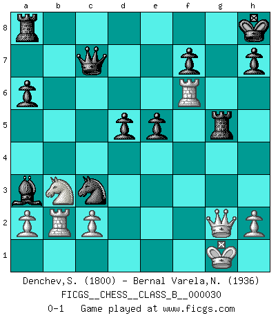 Last move : 0-1 2007 November 6 18:50:59 [Event "FICGS__CHESS__CLASS_B__000030"] [Site "FICGS"] [Date "2007.09.30"] [Round "1"] [White "Denchev,Stanimir"] [Black "Bernal Varela,Nelson"] [Result "0-1"] [WhiteElo "1800"] [BlackElo "1936"] 1.e4 c5 2.Nf3 d6 3.d4 cxd4 4.Nxd4 Nf6 5.Nc3 a6 6.Bc4 e6 7.O-O b5 8.Bd3 Bb7 9.Qe2 Be7 10.f4 Nbd7 11.Be3 O-O 12.g4 b4 13.g5 bxc3 14.gxf6 Nxf6 15.Rf3 cxb2 16.Rb1 Bxe4 17.Bxe4 Nxe4 18.Rxb2 Qc7 19.f5 e5 20.Nb3 d5 21.Nd2 Nc3 22.Qg2 Kh8 23.Nb3 Ba3 24.f6 gxf6 25.Rxf6 Rg8 26.Bg5 Rxg5 0-1 Sicilian : Najdorf, Lipnitzky attack Kingside Castling by player White (move 7) Kingside Castling by player Black (move 11) Player Black won this chess game. Follow this game move after move (download)Chess is thirty to forty percent psychology. You don't have this when you play a computer. I can't confuse it. (Judith Polgar) Es gibt nur zwei wahre Schachgenies - das andere war Wilhelm Steinitz, der Weltmeister von 1872 bis 1894. (Robert James Fischer) No hay otro maestro que tenga una voluntad terrífica de ganar. Al tablero, el irradía peligro y aún los oponentes mas fuertes tienden a congelarse como liebres cuando olfatean a una pantera. Aún sus debilidades son peligrosas. Con las blancas, su juego de apertura es predecible - te es posible hacer planes en su contra - pero es tan fuerte que tus planes casi nunca funcionan. En el juego medio, su precisión e invención son fabulosas y en finales, tú simplemente no le puedes vencer. (Experto Alemán anónimo) Le pion, dans sa simplicité, marche droit devant lui, mais lorsqu'il prend, il le fait obliquement? Ainsi l'homme, tant qu'il reste pauvre, marche dans la droiture et vit honnêtement, mais lorsqu'il recherche les honneurs, il flatte, se parjure et, par les voies obliques, cherche une position supérieure sur l'échiquier du monde. (Jean de Galles) Difficult things take a long time, impossible things a little longer. (Author unknown)