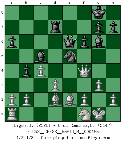 Last move : 1/2-1/2 2025 May 16 18:7:47 [Event "FICGS__CHESS__RAPID_M__000166"] [Site "FICGS"] [Date "2025.03.24"] [Round "1"] [White "Ligon,Scott"] [Black "Cruz Ramirez,Eliecer"] [Result "1/2-1/2"] [WhiteElo "2326"] [BlackElo "2147"] 1.e4 e5 2.Nf3 Nc6 3.Bb5 a6 4.Ba4 Nf6 5.O-O Be7 6.Re1 b5 7.Bb3 O-O 8.c3 d5 9.exd5 Nxd5 10.Nxe5 Nxe5 11.Rxe5 c6 12.Re1 Bd6 13.d3 Bf5 14.Qf3 Re8 15.Rxe8+ Qxe8 16.Nd2 Qe1+ 17.Nf1 Bg6 18.g3 b4 19.c4 Nf6 20.Qxc6 Rd8 21.Qb6 Rd7 22.Bc2 Ng4 23.Rb1 Qe2 24.Bd2 Ne5 25.Qe3 Qh5 26.Bd1 Qf5 27.Be2 f6 28.Ra1 Bc5 29.Qf4 Qe6 1/2-1/2 Follow this game move after move (download)In Chess, at least, the brave inherit the earth. (Edmar Mednis) Je älter ich werde, um so mehr schätze ich die Bauern. (Paul Keres) Nunca nadie ha ganado una partida de Ajedrez rindiendose. (Unknown) Le génie consiste à savoir transgresser les règles au moment opportun. (Teichmann) True nature is revealed in times of difficulty. (Chinese proverb)