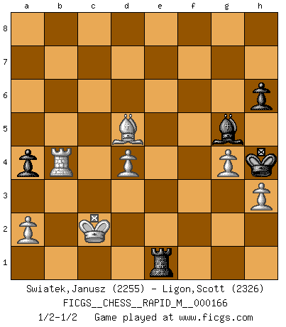 Last move : 1/2-1/2 2025 June 12 23:34:31 [Event "FICGS__CHESS__RAPID_M__000166"] [Site "FICGS"] [Date "2025.03.24"] [Round "1"] [White "Swiatek,Janusz"] [Black "Ligon,Scott"] [Result "1/2-1/2"] [WhiteElo "2255"] [BlackElo "2326"] 1.e4 c5 2.Nf3 d6 3.d4 cxd4 4.Nxd4 Nf6 5.Nc3 a6 6.Bg5 e6 7.f4 h6 8.Bh4 Be7 9.Qf3 Nbd7 10.O-O-O Qc7 11.Be2 b5 12.Bxf6 Nxf6 13.e5 Bb7 14.Qg3 dxe5 15.fxe5 Ne4 16.Nxe6 Qxc3 17.Nxg7+ Kf8 18.Ne6+ Ke8 19.Qxc3 Nxc3 20.Nc7+ Kf8 21.bxc3 Ba3+ 22.Kb1 Rc8 23.Nd5 Bxd5 24.Rxd5 Rg8 25.Bf3 Rxc3 26.Rd3 Rxd3 27.cxd3 Bc5 28.Rc1 Bd4 29.Rc8+ Kg7 30.Rc6 a5 31.e6 fxe6 32.Rxe6 Rc8 33.Be4 Bf6 34.Ra6 a4 35.Rc6 Rb8 36.h3 Kf7 37.Bd5+ Kg6 38.g4 Rf8 39.Rb6 Kg5 40.Be6 Kh4 41.Rxb5 Bg5 42.d4 Rf4 43.Rb4 Re4 44.Bd5 Re1+ 45.Kc2 1/2-1/2 Follow this game move after move (download)The boy (then a 12 year old boy named Anatoly Karpov) doesn't have a clue about Chess, and there's no future at all for him in this profession. (Mikhail Botvinnik) Jeder Fehler erscheint unglaublich dumm, wenn andre ihn begehen. (Georg Christoph Lichtenberg) Ser exitoso en el Ajedrez te permite descubrir tu propia personalidad. Eso es lo que deseo para los niños de mi clase. (Saudin Robovic) Toutes choses étant égales, c'est la conviction qui gagne. Alliée à une volonté de vaincre, elle sert de détonateur, suscite des idées, disperse les doutes et aide à penser clairement. (Robert Fischer) Looking at the proliferation of personal web pages on the Net, it looks like very soon everyone on Earth will have 15 megabytes of fame. (M.G. Sriram)
