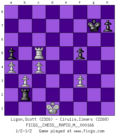 Last move : 1/2-1/2 2025 April 20 15:32:20 [Event "FICGS__CHESS__RAPID_M__000166"] [Site "FICGS"] [Date "2025.03.24"] [Round "1"] [White "Ligon,Scott"] [Black "Cirulis,Ilmars"] [Result "1/2-1/2"] [WhiteElo "2326"] [BlackElo "2268"] 1.e4 c5 2.Nf3 d6 3.d4 cxd4 4.Nxd4 Nf6 5.Nc3 g6 6.Be3 Bg7 7.f3 Nc6 8.Qd2 O-O 9.O-O-O d5 10.exd5 Nxd5 11.Nxc6 bxc6 12.Bd4 Bxd4 13.Qxd4 Qb6 14.Na4 Qa5 15.b3 Qc7 16.c4 Nb6 17.Nc5 a5 18.a4 e5 19.Qd6 Ra7 20.g4 Nd5 21.Qxc7 Rxc7 22.Bd3 Nb4 23.g5 f6 24.gxf6 Rxf6 25.Be4 Rcf7 26.Rd8+ Rf8 27.Rhd1 Kg7 28.R8d2 Rf4 29.Nd7 Re8 30.Rd6 Rh4 31.R1d2 Rd8 32.Nxe5 Rxd6 33.Rxd6 Rxh2 34.Kd1 Rb2 35.Nxc6 Nxc6 36.Rxc6 Bf5 37.Bxf5 gxf5 38.Rc5 Kf6 39.Rc6+ Kg7 40.Rc5 1/2-1/2 Follow this game move after move (download)We like to think. (Gary Kasparov) Versuche, dich von der Sklaverei der Eröffnungsvarianten zu befreien. Stattdessen soll man gewisse Typenpositionen erlernen, die man eingehend analysiert. (Aaron Nimzowitsch) Sin errores no puede haber brillantez. (Emanuel Lasker) Je ne crois pas en la psychologie, je crois aux bons coups. (Robert Fischer) No enterprise is more likely to succeed than one concealed from the enemy until it is ripe for execution. (Niccolo Machiavelli)
