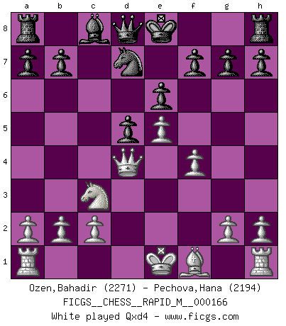 Last move : 1-0 2025 June 17 9:0:38 [Event "FICGS__CHESS__RAPID_M__000166"] [Site "FICGS"] [Date "2025.03.24"] [Round "1"] [White "Ozen,Bahadir"] [Black "Pechova,Hana"] [Result "1-0"] [WhiteElo "2271"] [BlackElo "2194"] 1.e4 e6 2.d4 d5 3.Nc3 Nf6 4.e5 Nfd7 5.f4 c5 6.Nf3 Nc6 7.Be3 cxd4 8.Nxd4 Bc5 9.Qd2 Nxd4 10.Bxd4 Bxd4 11.Qxd4 Qb6 12.Nb5 Qxd4 13.Nxd4 1-0 This chess game has been lost on time (started : 2025.03.24 7:36:15) Follow this game move after move (download)Chess is a matter of delicate judgment, knowing when to punch and how to duck. (Bobby Fischer) Bis zum Jahr 1971 verlief in meiner Schachkariere alles glatt. Dieses dramatische Match [Fischer-Taimanov 6:0] machte mein Leben zur Hölle. (Mark Taimanov) Solo los afeminados hacen el Enroque. (Rob Sillars) On croit qu'il y a plus de mauvais joueurs que de bons joueurs, c'est faux : Il y a autant de joueurs qui gagnent que de joueurs qui perdent. (Philippe Geluck) The good fighters of old first put themselves beyond the possibility of defeat, and then waited for an opportunity of defeating the enemy. (Sun Tzu)