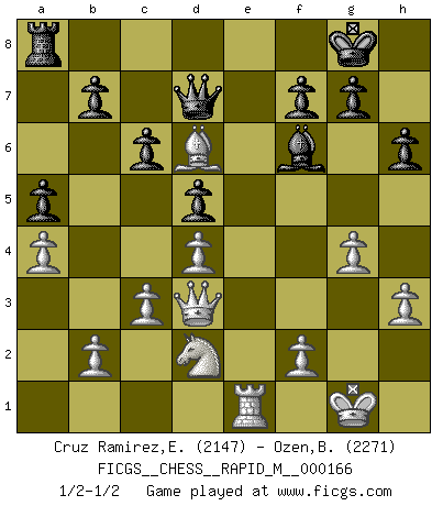 Last move : 1/2-1/2 2025 May 1 8:19:43 [Event "FICGS__CHESS__RAPID_M__000166"] [Site "FICGS"] [Date "2025.03.24"] [Round "1"] [White "Cruz Ramirez,Eliecer"] [Black "Ozen,Bahadir"] [Result "1/2-1/2"] [WhiteElo "2147"] [BlackElo "2271"] 1.e4 e5 2.Nf3 Nc6 3.Bb5 Nf6 4.O-O Nxe4 5.Re1 Nd6 6.Nxe5 Be7 7.Bf1 Nxe5 8.Rxe5 O-O 9.d4 Bf6 10.Re1 Re8 11.Bf4 Rxe1 12.Qxe1 Ne8 13.c3 d5 14.Nd2 c6 15.h3 Nd6 16.Qe3 Bf5 17.g4 Bg6 18.Re1 h6 19.Bd3 Bxd3 20.Qxd3 a5 21.a4 Qd7 22.Bxd6 1/2-1/2 Follow this game move after move (download)When I asked Fischer why he had not played a certain move in our game, he replied: 'Well, you laughed when I wrote it down !' (Mikhail Tal) Wer sich die Fähigkeit anerziehen will im Schach selbstständig zu denken, der muß alles meiden, was leblos ist: ausgeklügelte Theorien, die sich auf sehr wenige Beispiele und eine Menge Hirngespinste stützen. (Emanuel Lasker) Los tropiezos estan todos ahí en el tablero, esperando que se cometan. (Savielly Tartakover) La menace est plus forte que l'exécution. (Aaron Nimzovitch) Creativity is inventing, experimenting, growing, taking risks, breaking rules, making mistakes, and having fun. (Mary Lou Cook)