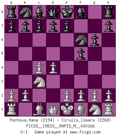 Last move : 0-1 2025 May 18 14:10:49 [Event "FICGS__CHESS__RAPID_M__000166"] [Site "FICGS"] [Date "2025.03.24"] [Round "1"] [White "Pechova,Hana"] [Black "Cirulis,Ilmars"] [Result "0-1"] [WhiteElo "2194"] [BlackElo "2268"] 1.d4 f5 2.c4 Nf6 3.Nc3 g6 0-1 Follow this game move after move (download)If your opponent cannot do anything active, then don't rush the position; instead you should let him sit there, suffer, and beg you for a draw. (Jeremy Silman) Meine Liebe ist Schach, Schach, Schach. Ich muss jeden Tag Schach spielen, deshalb fühle ich mich so stark. (Miguel Najdorf) Yo creo que el Ajedrez posee una magia que es también una ayuda en la edad avanzada. Una rodilla reumática es olvidada durante una partida de Ajedrez y otros eventos pueden parecer algo sin importancia comparada a una catástrofe en el tablero de Ajedrez. (Vlastimil Hort) L'attaque fait le spectacle, la défense gagne les matchs. (Dicton footballistique) Lottery : A tax on people who are bad at math. (Author unknown)
