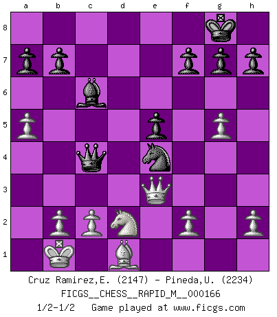 Last move : 1/2-1/2 2025 April 29 23:55:58 [Event "FICGS__CHESS__RAPID_M__000166"] [Site "FICGS"] [Date "2025.03.24"] [Round "1"] [White "Cruz Ramirez,Eliecer"] [Black "Pineda,Ulises"] [Result "1/2-1/2"] [WhiteElo "2147"] [BlackElo "2234"] 1.e4 e6 2.d4 d5 3.Nc3 Nf6 4.Bg5 dxe4 5.Nxe4 Be7 6.Nxf6+ Bxf6 7.Bxf6 Qxf6 8.Qd2 O-O 9.Nf3 c5 10.O-O-O Rd8 11.Qc3 cxd4 12.Rxd4 Bd7 13.Rc4 Qh6+ 14.Kb1 Bc6 15.Be2 Nd7 16.Rd1 e5 17.a4 Qg6 18.g4 Qe6 19.a5 Nf6 20.Rxd8+ Rxd8 21.g5 Ne4 22.Qe3 Rd1+ 23.Bxd1 Qxc4 24.Nd2 1/2-1/2 Follow this game move after move (download)I like to say that Bobby Fischer was the greatest player ever. But what made Fischer a genius was his ability to blend an American freshness and pragmatism with Russian ideas about strategy. (Bruce Pandolfini) Im Schach gibt es keinen Platz für Galanterie. (Irving Chernev) Durante una competencia de Ajedrez, un Maestro de Ajedrez deberá ser una combinación de presa de caza y un Monge. (Alexander Alekhine) Des idées, des idées, j'en ai cent, j'en ai mille. Des bonnes, des mauvaises, applicables, irréalisables... Il suffit de faire le tri ! (Roos) When you've done things right people won't know you've done anything at all. (Futurama)