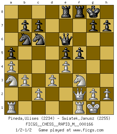 Last move : 1/2-1/2 2025 April 30 0:19:52 [Event "FICGS__CHESS__RAPID_M__000166"] [Site "FICGS"] [Date "2025.03.24"] [Round "1"] [White "Pineda,Ulises"] [Black "Swiatek,Janusz"] [Result "1/2-1/2"] [WhiteElo "2234"] [BlackElo "2255"] 1.e4 e5 2.Nf3 Nc6 3.Bc4 Bc5 4.a4 Nf6 5.d3 a5 6.Be3 Bxe3 7.fxe3 d5 8.exd5 Nxd5 9.Qe2 O-O 10.O-O Nb6 11.Bb3 Qe7 12.e4 Be6 13.Bxe6 Qxe6 14.b3 Rae8 15.Qf2 f5 16.Na3 1/2-1/2 Follow this game move after move (download)Chess is in its essence a game, in its form an art, and in its execution a science. (Baron Tassilo) Schach ist Kampf, hauptsächlich jedoch gegen die eigenen Fehler. (Savielly Grigorievitsch Tartakower) Con el fin de mejorar tu juego, debes de estudiar los finales antes que todo, ya que mientras que los finales pueden ser estudiados y dominados por sí mismos, el juegomedio y la apertura deben de ser estudiados en relación con los finales. (José Raúl Capablanca) Les Echecs sont et restent toujours un combat, un combat intégral comme la boxe, la lutte ou un autre sport, et où il doit y avoir un vainqueur et un vaincu. (Joseph Emil Diemer) To steal ideas from one person is plagiarism. To steal from many is research. (Unknown)