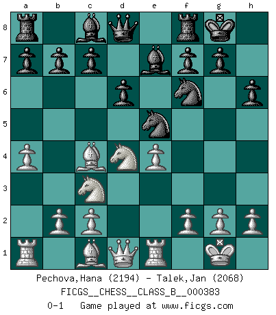 Last move : 0-1 2025 June 4 11:11:12 [Event "FICGS__CHESS__CLASS_B__000383"] [Site "FICGS"] [Date "2025.03.24"] [Round "1"] [White "Pechova,Hana"] [Black "Talek,Jan"] [Result "0-1"] [WhiteElo "2194"] [BlackElo "2068"] 1.e4 d6 2.d4 Nf6 3.Nc3 e5 4.Nf3 Nbd7 5.Bc4 Be7 6.O-O O-O 7.Re1 h6 8.a4 exd4 9.Nxd4 Ne5 0-1 Follow this game move after move (download)I have added these principles to the law: get the Knights into action before both Bishops are developed. (Emanuel Lasker) Ich kenne Menschen, die allen Willen der Welt besitzen und doch nicht Schach spielen können. (Robert James Fischer) Existen dos clases de sacrificios: los correctos y los míos. (Mikhail Tal) Toutes choses étant égales, c'est la conviction qui gagne. Alliée à une volonté de vaincre, elle sert de détonateur, suscite des idées, disperse les doutes et aide à penser clairement. (Robert Fischer) Internet: Absolute communication, absolute isolation. (Paul Carvel)