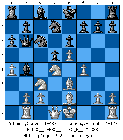 Last move : 1-0 2025 July 25 11:21:8 [Event "FICGS__CHESS__CLASS_B__000383"] [Site "FICGS"] [Date "2025.03.24"] [Round "1"] [White "Vollmer,Steve"] [Black "Upadhyay,Rajesh"] [Result "1-0"] [WhiteElo "1843"] [BlackElo "1812"] 1.e4 e6 2.d4 d5 3.Nc3 Nf6 4.e5 Nfd7 5.f4 c5 6.Nf3 Nc6 7.Be3 a6 8.a4 Qb6 9.Rb1 cxd4 10.Nxd4 Bb4 11.Be2 Qa5 12.Qd3 Nc5 13.Qd1 Bxc3+ 14.bxc3 Qxc3+ 15.Qd2 Qxd2+ 16.Kxd2 Ne4+ 17.Kd3 1-0 This chess game has been lost on time (started : 2025.03.24 12:23:6) Follow this game move after move (download)Let the perfectionist play postal. (Yasser Seirawan) Um sich vor der Gefahr einer Erkältung zu schützen, sorge der wanderlustige König beizeiten für ein brauchbares Versteck. (Aaron Nimzowitsch) Desconfianza es la característica mas necesaria de un jugador de Ajedrez. (Siegbert Tarrasch) J'ai vu le vaincu d'Echecs jouer des années durant dans l'espoir de la fête de la victoire. Car tu es plus riche de ce qu'elle existe si même elle n'est point pour toi. Ainsi de la perle du fond des mers. (Antoine de Saint-Exupéry) The absolute truth is the thing that makes people laugh. (Carl Reiner)