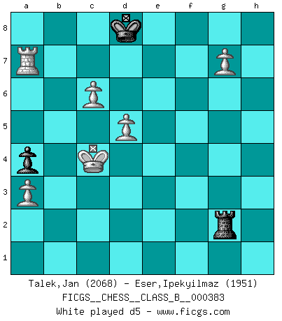 Last move : 1-0 2025 September 10 9:24:13 [Event "FICGS__CHESS__CLASS_B__000383"] [Site "FICGS"] [Date "2025.03.24"] [Round "1"] [White "Talek,Jan"] [Black "Eser,Ipekyilmaz"] [Result "1-0"] [WhiteElo "2068"] [BlackElo "1951"] 1.d4 d6 2.e4 g6 3.Nc3 Bg7 4.Be3 h6 5.f4 c6 6.h3 d5 7.e5 h5 8.Nf3 Nh6 9.Be2 a6 10.Qd2 a5 11.O-O-O a4 12.a3 b6 13.Rdg1 b5 14.g4 Qa5 15.gxh5 Bf5 16.hxg6 fxg6 17.Nh4 b4 18.Nd1 bxa3 19.bxa3 Qxd2+ 20.Bxd2 Be4 21.Bf3 Bxf3 22.Nxf3 Nf5 23.Ne3 Nxe3 24.Bxe3 Nd7 25.Rxg6 Bf8 26.Rxc6 Nb8 27.Rc3 Nd7 28.e6 Nf6 29.Ng5 Bg7 30.Rc7 Kd8 31.Rc6 Ke8 32.h4 Rh5 33.Kd2 Kf8 34.Ke2 Ng4 35.Kf3 Nxe3 36.Kxe3 Bf6 37.Rc5 Ra6 38.Rxd5 Bxg5 39.Rf5+ Ke8 40.fxg5 Rxe6+ 41.Re5 Rc6 42.c4 e6 43.c5 Kf7 44.Kd3 Rc7 45.Kc4 Rb7 46.Rf1+ Kg7 47.Rxe6 Rxh4 48.c6 Ra7 49.Rfe1 Rh2 50.Re7+ Rxe7 51.Rxe7+ Kf8 52.Ra7 Ke8 53.g6 Rg2 54.g7 Kd8 55.d5 Kc8 56.Rf7 Rg5 57.Rf8+ Kc7 58.Kc5 Rg6 59.d6+ Rxd6 60.Rf7+ Kc8 61.Kxd6 Kd8 62.Rf8+ 1-0 Follow this game move after move (download)One doesn't have to play well, it's enough to play better than your opponent. (Siegbert Tarrasch) Ein Gewinn durch eine ungenaue Kombination, sei sie auch noch so vorzeigbar, erfüllt mich mit Schaudern. (Wilhelm Steinitz) El jugador blanco perdió porque fallo en recordar la coreccta continuación y tuvo que pensar por sí mismo las movidas. (Siegbert Tarrasch) Ne tendez aucun piège pour le plaisir ! Ne jouez rien dans l'espoir que l'adversaire réagisse de façon stupide ! Prenez toujours pour acquis que l'adversaire va trouver le meilleur coup ! Ne jouez jamais de coup dans l'espoir que l'adversaire ne voie pas la menace ! Chacun de vos coups doit améliorer la position d'une façon ou d'une autre. However beautiful the strategy, you should occasionally look at the results. (Winston Churchill)
