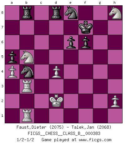 Last move : 1/2-1/2 2025 May 19 7:47:38 [Event "FICGS__CHESS__CLASS_B__000383"] [Site "FICGS"] [Date "2025.03.24"] [Round "1"] [White "Faust,Dieter"] [Black "Talek,Jan"] [Result "1/2-1/2"] [WhiteElo "2075"] [BlackElo "2068"] 1.d4 c6 2.c4 d5 3.Nc3 dxc4 4.e3 b5 5.a4 b4 6.Ne4 Qd5 7.Nd2 c3 8.bxc3 bxc3 9.Nb1 Qa5 10.Qc2 Nf6 11.Qxc3 Qxc3+ 12.Nxc3 e6 13.Ba3 Bxa3 14.Rxa3 Na6 15.Nf3 Nb4 16.Rb3 Rb8 17.Kd2 Ke7 18.Ne5 Bd7 19.Be2 c5 20.Rhb1 Rhd8 21.g4 h6 22.f4 a5 23.g5 hxg5 24.fxg5 Ne8 25.Bb5 cxd4 26.exd4 Bxb5 27.Nxb5 f6 28.gxf6+ gxf6 29.Ng6+ Kf7 30.Nh8+ Kf8 31.Ng6+ Kf7 32.Nh8+ Kf8 33.Ng6+ Kf7 34.Nh8+ 1/2-1/2 Follow this game move after move (download)In blitz, the Knight is stronger than the Bishop. (Vlastimil Hort) Ich glaube nicht an Psychologie, ich glaube an gute Züge. (Robert James Fischer) Cuando no sepas que mover, espera por una idea que se le venga a la la cabeza de tu oponente. Tenlo por seguro de que esa idea estará incorrecta. (Siegbert Tarrasch) Le système Elo représente seulement une moyenne. Il est simplement un indicateur de votre stabilité. (Anatoli Karpov) Opportunities multiply as they are seized. (Sun Tzu)