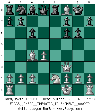 Last move : 0-1 2025 September 22 0:4:59 [Event "FICGS__CHESS__THEMATIC_TOURNAMENT__000272"] [Site "FICGS"] [Date "2025.03.25"] [Round "1"] [White "Ward,David"] [Black "Broekhuizen,A. T. S."] [Result "0-1"] [WhiteElo "2208"] [BlackElo "2249"] 1.e4 c6 2.d4 d5 3.Nc3 dxe4 4.Nxe4 Nf6 5.Nxf6+ exf6 6.Bc4 Bd6 7.Qh5 O-O 8.Ne2 g6 9.Qf3 Re8 10.Bh6 Bb4+ 11.Kf1 Bf8 12.Bxf8 Kxf8 13.Rd1 Nd7 14.h4 Ne5 15.Qa3+ Kg8 16.Bb3 a5 17.c4 Ng4 18.Bc2 h5 19.Qf3 Nh2+ 20.Rxh2 Bg4 21.Qd3 Bxe2+ 22.Qxe2 Rxe2 23.Kxe2 Qd6 24.Rh3 Qe6+ 0-1 Follow this game move after move (download)Chess makes man wiser and clear-sighted. (Vladimir Putin) Auf jeden Fall musst du zuerst Rechtsanwalt werden, damit du deine eigenen Interessen und die deiner Familie vertreten kannst. [Brief an seinen Sohn] (José Raúl Capablanca) Yo no le temo a Spassky. Todos saben que yo soy el mejor. Uno no necesita un torneo para probarlo. (Bobby Fischer) La victoire dans une partie d'Echecs appartient la plupart du temps à celui qui voit un peu plus loin que l'adversaire. (Lasker) Now be brave and don't look back. Don't look back. (Shmi Skywalker in Star Wars ep.1)
