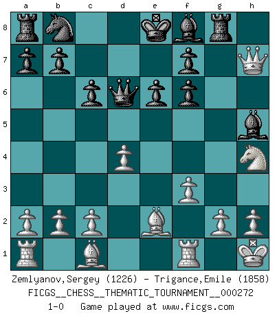 Last move : 1-0 2025 May 13 19:34:15 [Event "FICGS__CHESS__THEMATIC_TOURNAMENT__000272"] [Site "FICGS"] [Date "2025.03.25"] [Round "1"] [White "Zemlyanov,Sergey"] [Black "Trigance,Emile"] [Result "1-0"] [WhiteElo "1226"] [BlackElo "1858"] 1.e4 c6 2.d4 d5 3.Nc3 dxe4 4.Nxe4 Nf6 5.Nxf6+ gxf6 6.Nf3 Bg4 7.Be2 Qc7 8.O-O Rg8 9.Nh4 Qd7 10.f3 Bh5 11.Kh1 Qd6 12.Qd3 e6 13.Qxh7 1-0 Follow this game move after move (download)Bobby Fischer is the greatest Chess player who has ever lived. (Ken Smith) Im Internet Chess Club betrug mein Rating vorübergehend 3350 ELO-Punkte. (Sergej Karjakin) Los finales de Peón son del Ajedrez lo que el cesped es del Golf. (Cecil Purdy) Les Echecs ont trois composantes : le temps, l'espace et le matériel en dernier. (Mikhail Tal) There are two kinds of tragedy in this world, one is not getting what you want and the other is getting. (Lord of war)