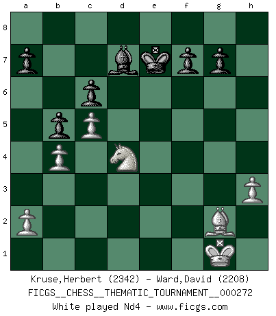 Last move : 1-0 2025 August 2 19:26:19 [Event "FICGS__CHESS__THEMATIC_TOURNAMENT__000272"] [Site "FICGS"] [Date "2025.03.25"] [Round "1"] [White "Kruse,Herbert"] [Black "Ward,David"] [Result "1-0"] [WhiteElo "2342"] [BlackElo "2208"] 1.e4 c6 2.d4 d5 3.Nc3 dxe4 4.Nxe4 Nf6 5.Nxf6+ exf6 6.c3 Bd6 7.Bd3 O-O 8.Qc2 Re8+ 9.Ne2 h5 10.O-O h4 11.h3 Nd7 12.Bd2 Nf8 13.Rae1 Bd7 14.c4 Rc8 15.f4 Ne6 16.f5 Ng5 17.c5 Bb8 18.b4 b5 19.Nf4 Qc7 20.Qd1 Rxe1 21.Rxe1 Rd8 22.Qg4 Qc8 23.Nh5 Re8 24.Rxe8+ Qxe8 25.Bxg5 Qe1+ 26.Bf1 fxg5 27.Qxg5 Be5 28.dxe5 Qxe5 29.Qf4 Qxf5 30.Qxf5 Bxf5 31.g4 hxg3 32.Nxg3 Bd7 33.Bg2 Kf8 34.Ne2 Ke7 35.Nd4 1-0 Follow this game move after move (download)Checkers is for tramps. (Paul Morphy) Ohne ihre Erfolge schmälern zu wollen würde ich sagen Petrosian, Spassky und Karpov verdanken ihre Siege ihren Trainern - Boleslavsky, Bondarevsky und Furman. (Mikhail Moiseyevich Botvinik) El ganador de una partida es aquel jugador que hace el penúltimo error. (Savielly Tartakover) Le système Elo représente seulement une moyenne. Il est simplement un indicateur de votre stabilité. (Anatoli Karpov) When you stop learning you start dying. (Scott Adams)