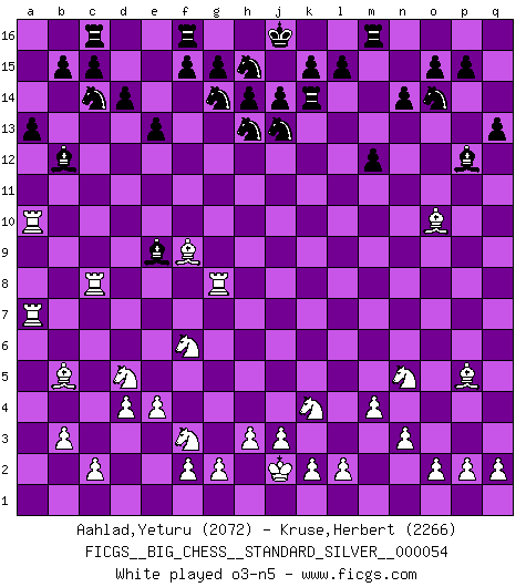 Last move : 0-1 2025 June 30 19:14:9 [Event "FICGS__BIG_CHESS__STANDARD_SILVER__000054"] [Site "FICGS"] [Date "2025.03.26"] [Round "2"] [White "Aahlad,Yeturu"] [Black "Kruse,Herbert"] [Result "0-1"] [WhiteElo "2072"] [BlackElo "2266"] 1.m2-m4 j15-k13 2.p1-o3 h16-o10 3.h2-g4 m15-m13 4.b1-c3 l16-p12 5.l1-p5 e15-e13 6.j2-k4 p16-o14 7.e2-e4 b16-c14 8.f1-b5 g16-j15 9.d2-d4 f16-b12 10.h1-m5 d15-d14 11.c1-l9 c16-l8 12.l9-m8 o10-a10 13.k1-h2 n15-n14 14.n2-n3 l8-k7 15.m5-n6 p12-l8 16.n6-g6 j15-g14 17.o1-f9 k13-j15 18.e1-e3 o16-f8 19.a1-d1 k16-l14 20.d1-d3 l14-j13 21.e3-f3 e16-f16 22.f3-f6 f8-e9 23.f6-a6 a10-p10 24.h2-j4 q15-q13 25.a6-a8 l8-m9 26.g6-k9 m9-p12 27.g4-f6 m16-m14 28.j4-l5 m14-k14 29.k9-d15 a16-c16 30.l5-k7 p12-k7 31.d15-o5 k7-p12 32.d3-g3 p10-c10 33.g3-g8 a15-a13 34.a8-c8 c10-d9 35.c3-d5 d9-a9 36.j1-j2 a9-a2 37.b2-b3 a2-a7 38.g1-f3 a7-e11 39.m1-a1 e11-o11 40.o5-o11 p12-o11 41.a1-a10 o11-p12 42.q1-a1 j15-h13 43.a1-a7 m13-m12 44.m8-o10 q16-m16 45.o3-n5 h15-f14 46.p5-k10 n14-n13 47.g8-n8 j13-l12 48.k10-h8 g14-j13 49.f6-g8 e9-d10 50.a7-d7 d10-g13 51.f3-g5 o14-m13 52.g5-j6 m13-n11 53.j6-k8 h13-j11 54.d7-o7 o15-o14 55.g8-j7 j16-j15 56.k4-l6 f14-g12 57.d5-e7 f15-f13 58.e7-g8 g12-e11 59.f9-e8 f13-f12 60.l6-m8 c14-d12 61.n5-m7 c15-c13 62.k2-k4 b15-b13 63.g8-e9 b12-e9 64.c8-c9 e9-b12 65.j7-g8 a13-a12 66.g8-h10 h14-h13 67.g2-g4 g13-h14 68.f2-f4 g15-g13 69.q2-q4 g13-g12 70.p2-p4 g12-g11 71.h10-j8 e11-g12 72.n8-n6 g12-f10 73.e8-f7 h14-g13 74.c9-b9 f16-g16 75.c2-c4 c16-b16 76.q4-q5 e13-e12 77.o2-o4 e12-e11 78.p4-p5 h13-h12 79.l2-l4 g16-h16 80.n6-b6 d12-b11 81.f7-b11 a12-b11 82.b9-b11 p12-l8 83.j8-l9 l8-e14 84.b11-b12 e14-a10 85.b12-b13 b16-b13 86.b6-b13 h16-b16 87.b13-a13 b16-a16 88.a13-a16 m16-a16 89.m7-n9 a10-f15 90.o7-q7 p15-p14 91.b5-a4 k14-k8 0-1 Follow this game move after move (download)We like to think. (Gary Kasparov) Später, ... hatte ich zunehmend Erfolg in entscheidenden Partien. Vielleicht weil ich eine einfache Wahrheit erkannte: nicht nur ich hatte Angst, auch mein Gegner. (Mikhail Nekhemyevich Tal) En el Ajedrez, tal como en la vida, las bendiciones de hoy pueden ser el veneno del mañana. (Assaic) Des combinaisons [dans le jeu d'échecs] pareilles à des mélodies. Je crois entendre pour ainsi dire la musique des coups... (Vladimir Nabokov) There is a very easy way to return from a casino with a small fortune : go there with a large one. (Jack Yelton)