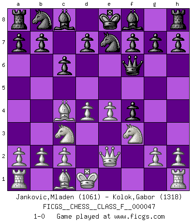 Last move : 1-0 2007 December 17 9:10:34 [Event "FICGS__CHESS__CLASS_F__000047"] [Site "FICGS"] [Date "2007.09.30"] [Round "1"] [White "Jankovic,Mladen"] [Black "Kolok,Gabor"] [Result "1-0"] [WhiteElo "1061"] [BlackElo "1318"] 1.e4 e5 2.f4 exf4 3.Bc4 c6 4.d4 Qe7 5.Qe2 Qh4+ 6.Kd1 Ne7 7.Nf3 Qf6 8.Nc3 1-0 This chess game has been lost on time (started : 2007.09.30 13:50:44) KGA : Bishop's gambit, Ruy Lopez defense Player White won this chess game. Follow this game move after move (download)A strong memory, concentration, imagination, and a strong will is required to become a great Chess player. (Bobby Fischer) Ivan Sokolov treibt mich als Beifahrer an mit go Loeky go - . (Loek van Wely) El muchacho (en ese entonces un niño de 12 años llamado Anatoly Karpov) no tiene ni idea de lo que es el Ajedrez y no hay futuro en absoluto para el en esta profesión. (Mikhail Botvinnik) Les Echecs mettent en conflit, non pas deux intelligences, mais deux volontés. (Lasker) The existence of forgetting has never been proved: We only know that some things don't come to mind when we want them. (Friedrich Nietzsche)