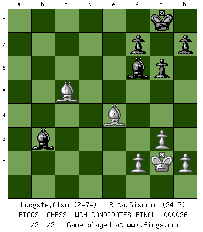 Last move : 1/2-1/2 2025 May 10 20:37:5 [Event "FICGS__CHESS__WCH_CANDIDATES_FINAL__000026"] [Site "FICGS"] [Date "2025.03.27"] [Round "5"] [White "Ludgate,Alan"] [Black "Rita,Giacomo"] [Result "1/2-1/2"] [WhiteElo "2474"] [BlackElo "2417"] 1.d4 Nf6 2.c4 e6 3.Nf3 d5 4.g3 dxc4 5.Bg2 Bb4+ 6.Bd2 a5 7.Qc2 c5 8.dxc5 Bxc5 9.O-O Nbd7 10.Na3 b6 11.Ne5 Nd5 12.Naxc4 Nxe5 13.Nxe5 O-O 14.Nd3 Be7 15.Nf4 Ba6 16.Nxd5 exd5 17.Bc3 Rc8 18.Rfd1 d4 19.Qe4 Bf6 20.Bxd4 Re8 21.Be3 Rxe4 22.Rxd8+ Rxd8 23.Bxe4 a4 24.Rc1 Bxe2 25.Bxb6 Rd1+ 26.Rxd1 Bxd1 27.b3 axb3 28.axb3 Bxb3 29.Bc5 g6 30.Kg2 1/2-1/2 Follow this game move after move (download)Chess is no whit inferior to the violin, and we have a large number of professional violinists. (Mikhail Botvinnik) Im Schach nämlich geht es darum, daß Ich des Gegners klein zu kriegen, sein Ego zu zerbrechen und zu zermahlen, seine Selbstachtung zu zertreten und zu verscharren und seine ganze mißachtenswerte sogenannte Persönlichkeit ein für alle Mal tot zu hacken und zu zerstampfen und dadurch die menschliche Gesellschaft von einer stinkenden Pestbeule zu befreien. Es ist ein königliches Spiel. (Robert James Fischer) Hoy en día, si tu no eres un Gran Maestro a los 14 años, es mejor que lo olvides. (Anand Viswanathan) On peut tirer plus d'utilité d'une partie perdue que de 100 parties gagnées. (Capablanca) There is a computer disease that anybody who works with computers knows about. It's a very serious disease and it interferes completely with the work. The trouble with computers is that you 'play' with them ! (Richard P. Feynman)