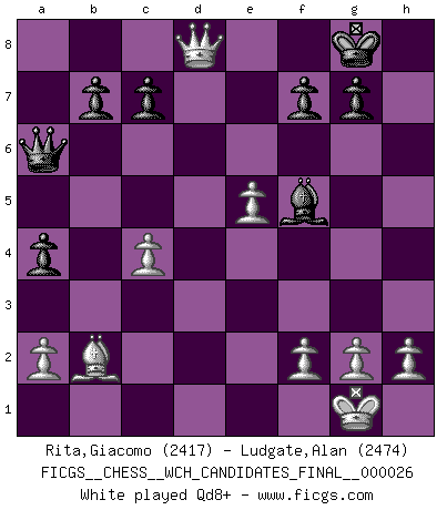 Last move : 1/2-1/2 2025 May 30 9:41:9 [Event "FICGS__CHESS__WCH_CANDIDATES_FINAL__000026"] [Site "FICGS"] [Date "2025.03.27"] [Round "8"] [White "Rita,Giacomo"] [Black "Ludgate,Alan"] [Result "1/2-1/2"] [WhiteElo "2417"] [BlackElo "2474"] 1.e4 e5 2.Nf3 Nf6 3.d4 Nxe4 4.Bd3 d5 5.Nxe5 Nd7 6.Nc3 Bb4 7.O-O Nxe5 8.dxe5 Nxc3 9.bxc3 Bxc3 10.Rb1 O-O 11.Bxh7+ Kxh7 12.Qd3+ Kg8 13.Qxc3 a5 14.Rd1 Ra6 15.Qf3 Qd7 16.Rxd5 Qc6 17.Qd1 Bf5 18.Rd2 Re8 19.Rb3 Rb6 20.Bb2 a4 21.Rxb6 Qxb6 22.c4 Qa6 23.Rd8 Rxd8 24.Qxd8+ Kh7 25.Qh4+ Kg8 26.Qd8+ Kh7 27.Qxc7 a3 28.Bc1 Qa4 29.Qd8 Qxc4 30.Qg5 Qc3 31.Qe3 Qa1 32.h3 b5 33.Qxa3 Qxe5 34.Qb4 Qa1 35.Qf4 Qb1 36.a3 Qe4 37.Qd2 Qd3 38.Qf4 Qe4 39.Qd2 Qd3 40.Qe1 Qe4 41.Qd1 Qd3 42.Qh5+ Kg8 43.Qg5 Be6 44.Qf4 Qc3 45.f3 Qc4 46.Qe3 Qb3 47.Qd4 Qd5 48.Qe3 Qd1+ 49.Kf2 Qb3 50.Qxb3 Bxb3 1/2-1/2 Follow this game move after move (download)Capture of the adverse King is the ultimate but not the first object of the game. (William Steinitz) Jede Eröffnung ist gut genug um gespielt zu werden, wenn nur ihr Ruf schlecht genug ist. (Savielly Grigorievitsch Tartakower) En el Ajedrez, cuando menos, el valiente hereda la tierra. (Edmar Mednis) Les Echecs sont affaire de jugement sensible. Savoir quand frapper et quand esquiver. (Fischer) If only people were all showed a certain minimum level of niceness; if only people didn't retract verbal draw offers (without draw box ticked) on ficgs; if only people didn't kill; if only people didn't run concentration / extermination camps, if only people didn't drop nuclear bombs on Hiroshima and Nagasaki, and so on - it would be a much more beautiful world. But sadly, things are not so... (Normajean Yates)