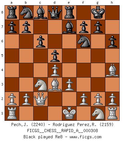 Last move : 1/2-1/2 2025 September 13 21:13:8 [Event "FICGS__CHESS__RAPID_A__000308"] [Site "FICGS"] [Date "2025.03.29"] [Round "1"] [White "Pech,Jaroslav"] [Black "Rodriguez Perez,Rene"] [Result "1/2-1/2"] [WhiteElo "2240"] [BlackElo "2159"] 1.c4 e6 2.d4 d5 3.Nc3 Nf6 4.cxd5 exd5 5.Bg5 c6 6.e3 h6 7.Bh4 Be7 8.Bd3 O-O 9.Qc2 Re8 10.Nge2 Nbd7 11.O-O Ne4 12.Bxe7 Qxe7 13.Bxe4 dxe4 14.d5 f5 15.Rad1 Ne5 16.Nf4 Kh7 17.Rd2 Qg5 18.Kh1 Bd7 19.Rfd1 Qe7 20.Kg1 Qf7 21.Qb3 Rab8 22.h3 a6 23.dxc6 Qxb3 24.axb3 Bxc6 25.Nce2 Re7 26.Rd6 Nf7 27.R6d2 Ne5 28.Nd4 Rf7 29.Rc2 g5 30.Nfe2 Rd8 31.Rc5 Rd5 32.Rxd5 Bxd5 33.Ra1 Nc6 34.Nxc6 Bxc6 35.Nd4 f4 36.Rc1 Rf6 37.Rc5 Kg6 38.b4 Rd6 39.Kh2 Rd5 40.Rc4 Rd6 41.Rc5 Rd5 42.Rc4 Rd6 43.g3 fxe3 44.fxe3 Bb5 45.Rc5 Rf6 46.b3 Rf2+ 47.Kg1 Rf1+ 48.Kg2 Rb1 1/2-1/2 Follow this game move after move (download)There's never before been a Chess player with such a thorough knowledge of the intricacies of the game and such an absolutely indomitable will to win. I think Bobby is the greatest player that ever lived. (Lisa Lane) Das ganze Leben mit einer Ehefrau ist wie ein Endspiel mit ungleichfarbigen Läufern. (Viktor Kortschnoi) Botvinnik trató de alejar el misterio referente al Ajedrez, siempre relacionandolo a situaciones de la vida diaria. Solía llamar al Ajedrez un problema inexacto típico, similar a aquellos en que la gente tiene siempre que resolver a cada día. (Garry Kasparov) Un footballeur joue avec ses pieds, parfois avec sa tête. Un joueur d'échecs ne joue qu'avec sa tête. Et quand il ne joue plus, il meurt. (Jacob Murray) All battles are fought by scared men who'd rather be someplace else. (John Wayne in the movie In harm's way)