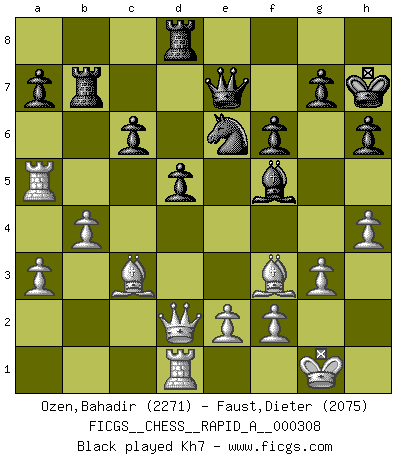 Last move : 1-0 2025 July 24 9:26:36 [Event "FICGS__CHESS__RAPID_A__000308"] [Site "FICGS"] [Date "2025.03.29"] [Round "1"] [White "Ozen,Bahadir"] [Black "Faust,Dieter"] [Result "1-0"] [WhiteElo "2271"] [BlackElo "2075"] 1.Nf3 Nf6 2.c4 c5 3.Nc3 Nc6 4.g3 d5 5.d4 e6 6.cxd5 exd5 7.Bg2 Be7 8.O-O O-O 9.dxc5 Bxc5 10.Na4 Be7 11.Be3 Bg4 12.Rc1 Qd7 13.Nc5 Bxc5 14.Rxc5 h6 15.Nd4 Rac8 16.Nxc6 bxc6 17.Ra5 Rfe8 18.Re1 Rc7 19.Bd4 Nh7 20.h4 Nf8 21.b4 Bh3 22.Bh1 Ne6 23.Be5 Rb7 24.Qd2 f6 25.Bc3 Rd8 26.Rd1 Qe7 27.a3 Bf5 28.Bf3 Kh7 29.Qc1 Rd6 30.Bd4 Nxd4 31.Rxd4 Re6 32.Qc3 Qe8 33.Rc5 Rbe7 34.b5 Rxe2 35.bxc6 Rc2 36.Qxc2 Bxc2 37.Rxc2 Rc7 38.Bxd5 f5 39.Bf3 Qf8 40.Rd3 Qf6 41.h5 Qa1+ 42.Kg2 Qf6 43.Rb3 1-0 Follow this game move after move (download)The passed Pawn is a criminal, who should be kept under lock and key. Mild measures, such as police surveillance, are not sufficient. (Aaron Nimzovich) Ein Remis kann durch Wiederholung von drei Zügen oder durch einen schlechte Zug erreicht werden. (Savielly Grigorievitsch Tartakower) Aquel que toma al Peón de Caballo de la Reina, se pasará la noche a dormir en la calle. (Anónimo) Il vaut mieux sacrifier les pièces de l'adversaire. (Xavier Tartacover) I would love to change the world, but they won't give me the source code. (Unknown)