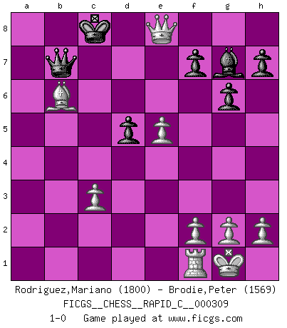 Last move : 1-0 2025 May 8 18:15:46 [Event "FICGS__CHESS__RAPID_C__000309"] [Site "FICGS"] [Date "2025.04.04"] [Round "1"] [White "Rodriguez,Mariano"] [Black "Brodie,Peter"] [Result "1-0"] [WhiteElo "1800"] [BlackElo "1569"] 1.e4 e6 2.d4 d5 3.e5 c5 4.c3 c4 5.b3 b5 6.a4 Bd7 7.axb5 Bxb5 8.Nd2 Ne7 9.bxc4 dxc4 10.Nxc4 Bxc4 11.Bxc4 Qc7 12.Bb5+ Nbc6 13.Ra6 O-O-O 14.Ne2 Rd5 15.Qa4 Rxb5 16.Qxb5 Qb7 17.Qa4 Kc7 18.O-O Kb8 19.Be3 g6 20.d5 exd5 21.Nd4 Bg7 22.Nxc6+ Nxc6 23.Rxc6 Rc8 24.Bxa7+ Ka8 25.Bb6 Kb8 26.Rxc8+ Kxc8 27.Qe8+ 1-0 Follow this game move after move (download)It is always better to sacrifice your opponent's men. (Savielly Tartakower) Ich war zu klein für die Schach-Schülermannschaft! (Woody Allen) Bendita sea la memoria de aquel que dio al mundo este juego inmortal. (A. G. Gardiner) Même un GMI sait rarement calculer sur plus de cinq coups une attaque à sacrifices. (Rudolf Spielmann) This is where the fun begins. (Anakin Skywalker in Star Wars ep.3)
