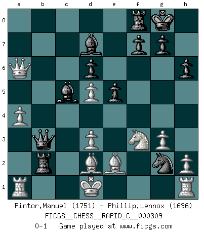 Last move : 0-1 2025 April 15 4:59:5 [Event "FICGS__CHESS__RAPID_C__000309"] [Site "FICGS"] [Date "2025.04.04"] [Round "1"] [White "Pintor,Manuel"] [Black "Phillip,Lennox"] [Result "0-1"] [WhiteElo "1751"] [BlackElo "1696"] 1.e4 e5 2.f4 Bc5 3.Nf3 d6 4.f5 Nf6 5.Nc3 h6 6.d3 Bd7 7.Be2 a5 8.a4 Nc6 9.Nd5 Nxd5 10.exd5 Ne7 11.c4 Nxf5 12.Bd2 c6 13.Qb3 O-O 14.Qxb7 Rb8 15.Qa6 cxd5 16.cxd5 Nh4 17.g3 Ng2+ 18.Kd1 Rxb2 19.Bxa5 Qb8 20.Bd2 Qb3+ 0-1 Follow this game move after move (download)Of all my Russian books, the defense contains and diffuses the greatest 'warmth' which may seem odd seeing how supremely abstract Chess is supposed to be. (Vladimir Nabokov) Der Traum, für den ich lebe, ist der von einem freien Russland. Viele mögen sagen: Russland hat doch ein Parlament, einen gewählten Präsidenten. Aber ich spüre, dass in meiner Heimat die Angst wiederkehrt. Eine Angst, sich frei zu äußern, bestimmte Dinge zu tun (Garry Kasparov) El jugador táctico debe saber que hacer cuando algo se debe de hacer. El estratégico debe saber que hacer cuando nada se debe de hacer. (Savielly Tartakover) Les Echecs mettent en conflit, non pas deux intelligences, mais deux volontés. (Lasker) Memory is a crazy woman that hoards colored rags and throws away food. (Austin O'Malley)