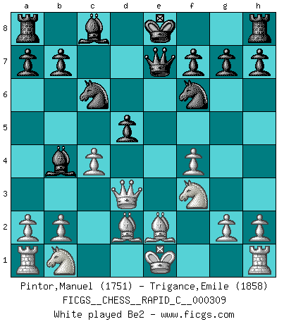 Last move : 1-0 2025 June 11 6:2:53 [Event "FICGS__CHESS__RAPID_C__000309"] [Site "FICGS"] [Date "2025.04.04"] [Round "1"] [White "Pintor,Manuel"] [Black "Trigance,Emile"] [Result "1-0"] [WhiteElo "1751"] [BlackElo "1858"] 1.e4 c5 2.f4 e6 3.Nf3 d5 4.exd5 exd5 5.d4 Nf6 6.c4 cxd4 7.Qxd4 Nc6 8.Qd3 Bb4+ 9.Bd2 Qe7+ 10.Be2 O-O 11.cxd5 Rd8 12.Nc3 Qc5 13.Qc4 Nxd5 14.Nxd5 Bxd2+ 15.Nxd2 Qxd5 16.Qxd5 Rxd5 17.O-O-O Be6 18.Bf3 Rc5+ 19.Kb1 Bf5+ 20.Be4 Nd4 21.Bxf5 Nxf5 22.g3 Rac8 23.Nb3 R5c7 24.Rc1 Rxc1+ 25.Rxc1 Rxc1+ 26.Kxc1 Kf8 27.Kd2 Ke7 28.Kd3 Kd6 29.Ke4 g6 30.Nd4 Nxd4 31.Kxd4 f6 32.b4 b5 33.g4 h5 34.f5 gxf5 35.gxh5 Ke7 36.Ke3 Kf7 37.Kf3 Kg7 38.Kf4 Kh6 39.Kxf5 Kxh5 40.Kxf6 1-0 Follow this game move after move (download)Chess is like war on a board. (Bobby Fischer) Das Schachspiel ist ein See, in welchem eine Mücke baden und ein Elefant ertrinken kann. (Emanuel Lasker) El ganar no lo es todo... pero el perder es nada. (Mednis) Il n'y a pas eu de défaite parce que je ne crois pas que cet ordinateur ait jamais existé. IBM a triché en refusant d'imprimer les modes de recherche de la machine. C'est évident, pendant le match, des coups décisifs ont été joués par des êtres humains. Aujourd'hui, les meilleurs spécialistes en informatique ne peuvent toujours pas expliquer comment Deep-Blue a pu jouer contre la logique des ordinateurs. IBM a gagné une guerre de communication, mais ils sont incapables de prouver que l'ordinateur a gagné tout seul. (Garry Kasparov) You can only get smarter by playing a smarter opponent. (Revolver, movie)