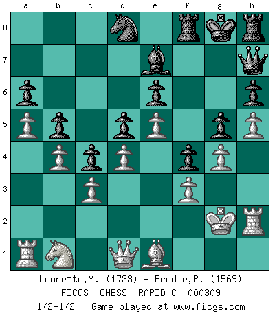 Last move : 1/2-1/2 2025 April 24 17:23:46 [Event "FICGS__CHESS__RAPID_C__000309"] [Site "FICGS"] [Date "2025.04.04"] [Round "1"] [White "Leurette,Marc-Antoine"] [Black "Brodie,Peter"] [Result "1/2-1/2"] [WhiteElo "1723"] [BlackElo "1569"] 1.e4 e6 2.d4 d5 3.e5 c5 4.c3 c4 5.Nf3 Ne7 6.b4 b5 7.a4 Bd7 8.a5 a6 9.Be2 Nf5 10.Bf4 Be7 11.Nbd2 O-O 12.O-O Nc6 13.h3 h6 14.g4 Nh4 15.Bg3 Ng6 16.Re1 f6 17.Nh4 Nxh4 18.Bxh4 g5 19.Bg3 f5 20.f3 f4 21.Bf2 Be8 22.Kg2 Kg7 23.Rh1 Rh8 24.Rh2 Bg6 25.Qc1 Qd7 26.h4 Bd3 27.Bf1 Bxf1+ 28.Qxf1 Raf8 29.h5 Nd8 30.Qb1 Qe8 31.Qc2 Kg8 32.Nb1 Qf7 33.Be1 Qh7 34.Qd1 1/2-1/2 Follow this game move after move (download)In the perfect Chess combination as in a first-rate short story, the whole plot and counter-plot should lead up to a striking finale, the interest not being allayed until the very last moment. (Yates and Winter) Ich hatte meine größten Erfolge, als ich 47 Jahre alt war. Kasparow war noch nicht mal 42 und hat das Schach schon im Stich gelassen. (Viktor Kortschnoi) Cuando no sepas que mover, espera por una idea que se le venga a la la cabeza de tu oponente. Tenlo por seguro de que esa idea estará incorrecta. (Siegbert Tarrasch) Mon pion favori sur ma case favorite ! Bronstein en parlant d'un coup de pion en h5 quand il avait les Noirs. When I took office, only high energy physicists had ever heard of what is called the World Wide Web... Now even my cat has its own page. (Bill Clinton, 1996)