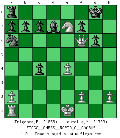 Last move : 1-0 2025 April 15 10:54:42 [Event "FICGS__CHESS__RAPID_C__000309"] [Site "FICGS"] [Date "2025.04.04"] [Round "1"] [White "Trigance,Emile"] [Black "Leurette,Marc-Antoine"] [Result "1-0"] [WhiteElo "1858"] [BlackElo "1723"] 1.e4 e5 2.d4 exd4 3.c3 dxc3 4.Bc4 cxb2 5.Bxb2 Bc5 6.Bxg7 Qg5 7.Bxh8 Qxg2 8.Qf3 Qg6 9.Ne2 d5 10.Rg1 dxc4 11.Rxg6 hxg6 12.Nbc3 Be6 13.Nf4 Bd7 14.Nfd5 Na6 15.Nf6+ Nxf6 16.Bxf6 Be7 17.Bxe7 Kxe7 18.Nd5+ Kf8 19.Qf6 Kg8 20.Ne7+ 1-0 Follow this game move after move (download)What is the object of playing a gambit opening?... To acquire a reputation of being a dashing player at the cost of losing a game. (Siegbert Tarrasch) Stil? Ich habe keinen Stil! (Anatoly Karpov) En la vida, como en el Ajedrez, los Peones propios obstruyen nuestro camino. La gran fortuna de un hombre, su comodidad, placer, hijos, libros, que deberían ayudarle a ganar, con mucha frecuencia lo ponen en Jaque Mate. (Charles Buxton) Tout change constamment, y compris dans le monde des Echecs. (Botvinnik) Over-the-board chess is the favorite of mortals, correspondence chess is the favorite of the gods. (Eduard Dyckhoff)