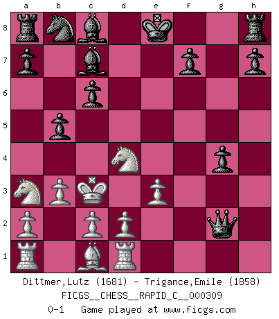 Last move : 0-1 2025 May 23 11:27:0 [Event "FICGS__CHESS__RAPID_C__000309"] [Site "FICGS"] [Date "2025.04.04"] [Round "1"] [White "Dittmer,Lutz"] [Black "Trigance,Emile"] [Result "0-1"] [WhiteElo "1681"] [BlackElo "1858"] 1.f4 e5 2.fxe5 d6 3.exd6 Bxd6 4.Nf3 g5 5.e3 g4 6.Nd4 Qh4+ 7.g3 Bxg3+ 8.Ke2 c6 9.Bg2 Bc7 10.b3 Nf6 11.Rf1 Qxh2 12.Rg1 Ne4 13.Kd3 Nf2+ 14.Kc3 Nxd1+ 15.Rxd1 Qxg2 16.Na3 b5 0-1 Follow this game move after move (download)Chess is as much a mystery as women. (Purdy) Ein Schachgenie ist jemand der verdammt gut Schach spielt. (Jonathan Levitt) ¿Se han dado cuenta de que Fischer casi nunca ha tenido piezas malas? El las intercambia y las piezas malas se quedan con sus oponenets. (Yuri Balashov) Pour moi, les échecs ne sont pas un jeu mais un art. (Alexandre Alekhine) The problem with manipulation is that people can turn on you. (Horatio Caine, C.S.I. Miami)
