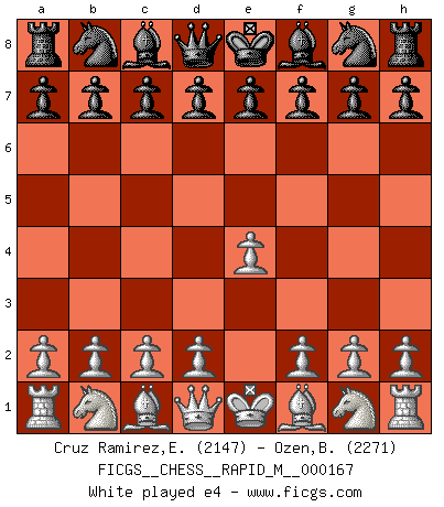 Last move : 1/2-1/2 2025 June 21 17:11:50 [Event "FICGS__CHESS__RAPID_M__000167"] [Site "FICGS"] [Date "2025.04.26"] [Round "1"] [White "Cruz Ramirez,Eliecer"] [Black "Ozen,Bahadir"] [Result "1/2-1/2"] [WhiteElo "2147"] [BlackElo "2271"] 1.e4 c6 2.d4 d5 3.Nc3 dxe4 4.Nxe4 Bf5 5.Ng3 Bg6 6.Nf3 Nd7 7.h4 h6 8.h5 Bh7 9.Bd3 Bxd3 10.Qxd3 e6 11.Bf4 Qa5+ 12.Bd2 Bb4 13.Ne4 Ngf6 14.Nd6+ Ke7 15.Nxb7 Bxd2+ 16.Nxd2 Qb4 17.Qb3 Qxd4 18.O-O-O Rab8 19.Qa3+ c5 20.Na5 Rhc8 21.f3 Nb6 1/2-1/2 Follow this game move after move (download)Why must I lose to this idiot ? (Aron Nimzovich) Es gibt zwei Arten von Opfern: Korrekte und meine. (Mikhail Nekhemyevich Tal) Con el fin de mejorar tu juego, debes de estudiar los finales antes que todo, ya que mientras que los finales pueden ser estudiados y dominados por sí mismos, el juegomedio y la apertura deben de ser estudiados en relación con los finales. (José Raúl Capablanca) Il (Jacob Murray) ne joue pas pour le bon coup, mais pour le meilleur. (Eloi Relange) I'll be back. (Arnold Schwarzenegger)