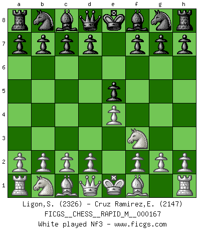Last move : 1/2-1/2 2025 June 4 19:32:58 [Event "FICGS__CHESS__RAPID_M__000167"] [Site "FICGS"] [Date "2025.04.26"] [Round "1"] [White "Ligon,Scott"] [Black "Cruz Ramirez,Eliecer"] [Result "1/2-1/2"] [WhiteElo "2326"] [BlackElo "2147"] 1.e4 e5 2.Nf3 Nc6 3.Bb5 a6 4.Ba4 Nf6 5.O-O Be7 6.Re1 b5 7.Bb3 O-O 8.c3 d5 9.exd5 Nxd5 10.Nxe5 Nxe5 11.Rxe5 c6 12.Re1 Bd6 13.d3 Bf5 14.Qf3 Qh4 15.g3 Qh3 16.Be3 Bxd3 17.Nd2 Qf5 18.a4 h6 19.Bd4 Rfe8 20.h4 Rxe1+ 21.Rxe1 Rd8 22.Qxf5 Bxf5 23.Ne4 Bf8 1/2-1/2 Follow this game move after move (download)When you are lonely, when you feel yourself an alien in the world, play Chess. This will raise your spirits and be your counselor in war. (Aristotle) Dein Körper muss in Topform sein. Dein Schach verfällt, wenn dein Körper verfällt. Der Körper kann nicht vom Geist getrennt werden. (Robert James Fischer) Dios mío, Bobby Fischer juega tan simple. (Alexei Suetin) Plusieurs personnes se sont demandées comment Tal faisait pour gagner... En fait, c'est très simple ! Il met ses pièces au centre de l'échiquier et les sacrifie quelque part ! (David Bronstein) See no evil, hear no evil, speak no evil. (The 3 monkeys)
