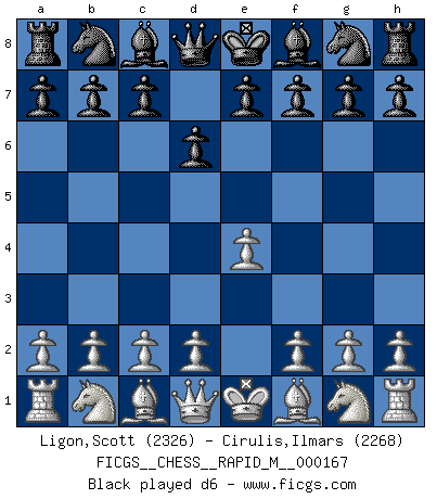 Last move : 1/2-1/2 2025 May 19 17:38:1 [Event "FICGS__CHESS__RAPID_M__000167"] [Site "FICGS"] [Date "2025.04.26"] [Round "1"] [White "Ligon,Scott"] [Black "Cirulis,Ilmars"] [Result "1/2-1/2"] [WhiteElo "2326"] [BlackElo "2268"] 1.e4 d6 2.d4 Nf6 3.Nc3 g6 4.Be3 Bg7 5.Qd2 a6 6.Nf3 b5 7.Bh6 O-O 8.Bd3 Nc6 9.e5 dxe5 10.Bxg7 Kxg7 11.dxe5 Ng4 12.O-O-O b4 13.Rhe1 Rb8 14.Na4 Qd5 15.b3 Ngxe5 16.Nxe5 Nxe5 17.Bf1 Qxd2+ 18.Rxd2 Nc6 19.Rd5 Nd8 20.Ra5 Ne6 21.Bc4 Rd8 22.Bxe6 Bxe6 23.Rxa6 Rb5 24.Rc6 Bd5 25.Rxc7 Bxg2 26.R1xe7 Rf5 27.Nc5 R8d5 28.Nd3 Rd4 29.Kb2 Rh4 30.a3 bxa3+ 31.Kxa3 h5 32.Ne5 Rhf4 33.b4 Rxf2 34.b5 g5 35.c4 g4 36.b6 Bh1 37.Rcd7 Rxh2 38.Rxf7+ Rxf7 39.Rxf7+ Kh6 40.c5 g3 41.Rf3 g2 42.Rg3 h4 43.Rg8 Rh3+ 44.Kb4 Kh5 45.c6 Rg3 46.Rh8+ Kg5 47.Nf3+ Rxf3 48.Rg8+ Kf6 49.b7 Rf1 50.Ka3 g1Q 51.Rxg1 Rxg1 52.b8Q 1/2-1/2 Follow this game move after move (download)Help your pieces so they can help you. (Paul Morphy) Im Blitz ist es einfacher mit einer Figur weniger anzugreifen, als sich mit einer Mehrfigur zu verteidigen. (Mikhail Nekhemyevich Tal) En partidas rápidas, el Caballo es mas poderoso que el Alfil. (Vlastimil Hort) Il n'y a pas eu de défaite parce que je ne crois pas que cet ordinateur ait jamais existé. IBM a triché en refusant d'imprimer les modes de recherche de la machine. C'est évident, pendant le match, des coups décisifs ont été joués par des êtres humains. Aujourd'hui, les meilleurs spécialistes en informatique ne peuvent toujours pas expliquer comment Deep-Blue a pu jouer contre la logique des ordinateurs. IBM a gagné une guerre de communication, mais ils sont incapables de prouver que l'ordinateur a gagné tout seul. (Garry Kasparov) At work, the authority of a person is inversely proportional to the number of pens that person is carrying. (Dan Rotaru)