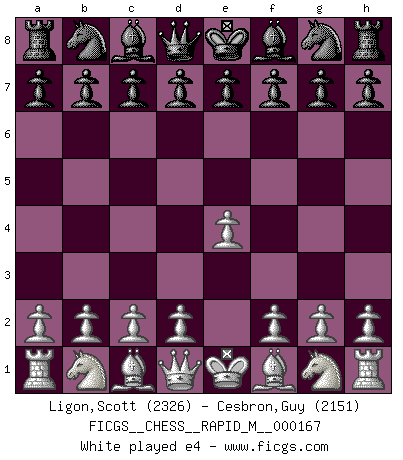 Last move : 1-0 2025 June 17 1:53:58 [Event "FICGS__CHESS__RAPID_M__000167"] [Site "FICGS"] [Date "2025.04.26"] [Round "1"] [White "Ligon,Scott"] [Black "Cesbron,Guy"] [Result "1-0"] [WhiteElo "2326"] [BlackElo "2151"] 1.e4 e6 2.d4 d5 3.Nc3 Nf6 4.e5 Nfd7 5.f4 c5 6.Nf3 Nc6 7.Be3 Be7 8.Qd2 O-O 9.dxc5 Nxc5 10.O-O-O a6 11.Kb1 b5 12.g4 b4 13.Bxc5 Bxc5 14.Na4 Be7 15.Bd3 Bd7 16.b3 Qc7 17.Rhe1 f6 18.exf6 Rxf6 19.f5 exf5 20.g5 R6f8 21.Bxa6 Rxa6 22.Qxd5+ Rf7 23.Qxd7 Qxd7 24.Rxd7 Bf8 25.R7d1 R6a7 26.Re6 Rac7 27.Nb6 Rfe7 28.Rxe7 Rxe7 29.Nd7 Re3 30.Nxf8 Rxf3 31.Ne6 Re3 32.Nd4 Ne7 33.a4 1-0 Follow this game move after move (download)War is the child of passion, passion is the child of narcissism and narcissism is the child. (...) Another game ? (Thibault de Vassal) Ich habe die besten Aussichten, den ersten Preis zu gewinnen - denn jeder muss gegen Steinitz spielen, nur ich nicht! (Wilhelm Steinitz) Yo creo que el Ajedrez posee una magia que es también una ayuda en la edad avanzada. Una rodilla reumática es olvidada durante una partida de Ajedrez y otros eventos pueden parecer algo sin importancia comparada a una catástrofe en el tablero de Ajedrez. (Vlastimil Hort) L'attaque fait le spectacle, la défense gagne les matchs. (Dicton footballistique) Luck never gives; it only lends. (Swedish proverb)