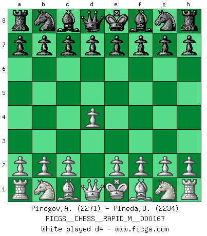 Last move : 1/2-1/2 2025 June 21 12:1:25 [Event "FICGS__CHESS__RAPID_M__000167"] [Site "FICGS"] [Date "2025.04.26"] [Round "1"] [White "Pirogov,Andrey Mikhaylovich"] [Black "Pineda,Ulises"] [Result "1/2-1/2"] [WhiteElo "2271"] [BlackElo "2234"] 1.d4 Nf6 2.c4 e6 3.Nc3 Bb4 4.e3 c5 5.Bd3 d5 6.cxd5 exd5 7.Nge2 c4 8.Bc2 Nc6 9.f3 O-O 10.O-O Re8 11.h3 Ba5 12.Kh1 h6 13.e4 dxe4 14.fxe4 Bxc3 15.bxc3 Nxe4 16.d5 Qh4 17.Kg1 Bxh3 18.Rf4 Qg5 19.Bxe4 Rxe4 20.Rf2 Qe7 21.gxh3 Rd8 22.Kh2 Rh4 23.Rf1 Qe5+ 24.Nf4 g5 25.Qe1 Rxd5 26.Qg3 Rd7 27.Re1 Qf5 28.Be3 Qe5 29.Ng2 Re4 30.Bf4 Qf5 31.Rxe4 Qxe4 32.Re1 Qf5 33.Re8+ Kh7 34.Be3 Rd3 35.Qc7 Qd7 36.Qxd7 Rxd7 37.h4 f6 38.h5 f5 39.Ne1 f4 40.Bg1 Rd1 41.Nf3 g4 42.Nd4 Rd2+ 43.Kh1 Rd1 44.Nxc6 f3 1/2-1/2 Follow this game move after move (download)Methodical thinking is of more use in Chess than inspiration. (C. J. S. Purdy) Schon mancher Spieler hat aufgegeben, um zu vermeiden, daß er eine Figur verliert. (Savielly Grigorievitsch Tartakower) Todos los jugadores de Ajedrez deberían tener un pasatiempo. (Savielly Tartakower) C'est la seule position que je connaisse où les deux camps sont mals. Propos prêtés à V. Anand. A clear conscience is usually the sign of a bad memory. (Unknown)