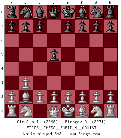 Last move : 1/2-1/2 2025 July 15 4:28:54 [Event "FICGS__CHESS__RAPID_M__000167"] [Site "FICGS"] [Date "2025.04.26"] [Round "1"] [White "Cirulis,Ilmars"] [Black "Pirogov,Andrey Mikhaylovich"] [Result "1/2-1/2"] [WhiteElo "2268"] [BlackElo "2271"] 1.b3 d5 2.Bb2 c5 3.e3 a6 4.Nf3 Nc6 5.g3 Bg4 6.h3 Bh5 7.d3 Nf6 8.Bg2 e6 9.O-O Bd6 10.Nc3 O-O 11.Ne2 h6 12.Nf4 Bxf3 13.Qxf3 d4 14.Nh5 Nxh5 15.Qxh5 dxe3 16.Bxc6 exf2+ 17.Kxf2 bxc6 18.Rae1 Qg5 19.Qxg5 hxg5 20.Bc1 Be7 21.Re5 Bf6 22.Re4 Rfd8 23.Ke2 Rd5 24.g4 a5 25.a4 Re8 26.Bd2 Bd8 27.Be3 f6 28.Rh1 Kf7 29.Rc4 Be7 30.h4 gxh4 31.Rxh4 Rb8 32.Bd2 Ra8 33.Be3 Bd6 34.Kf3 f5 35.Rh1 Rf8 36.Bd2 Ra8 1/2-1/2 Follow this game move after move (download)By this measure (on the gap between Fischer & his contemporaries), I consider him the greatest world champion. (Garry Kasparov) Ich verstehe Aljechins Kombinationen ganz gut; aber woher er diese Angriffschancen bekommt und wie er die Eröffnung behandelt das ist für mich ein Buch mit sieben Siegeln. (Rudolf Spielmann) Observen a Garry Kasparov. Después de una derrota, invariablemente el gana la próxima partida. Prácticamente hace pedazos a su siguiente oponente. Eso es algo que tenemos que aprender a lograr. (Maurice Ashley) À la honte des hommes, on sait que les lois du jeu sont les seules qui soient partout justes, claires, inviolables et exécutées. Pourquoi l'Indien qui a donné les règles du jeu d'échecs est-il obéi de bon gré dans toute la terre, et que les décrétales des papes, par exemple, sont aujourd'hui un objet d'horreur et de mépris ? C'est que l'inventeur des échecs combina tout avec justesse pour la satisfaction des joueurs, et que les papes, dans leurs décrétales, n'eurent en vue que leur seul avantage. L'Indien voulut exercer également l'esprit des hommes et leur donner du plaisir; les papes ont voulu abrutir l'esprit des hommes. Voltaire (Dictionnaire philosophique / Garnier 1967) The man who strikes first admits that his ideas have given out. (Chinese proverb)