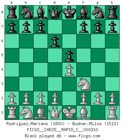Last move : 1-0 2025 May 15 6:14:23 [Event "FICGS__CHESS__RAPID_C__000310"] [Site "FICGS"] [Date "2025.04.26"] [Round "1"] [White "Rodriguez,Mariano"] [Black "Budnar,Milos"] [Result "1-0"] [WhiteElo "1800"] [BlackElo "1512"] 1.e4 e5 2.Nf3 d6 3.d4 Bg4 4.Nc3 Nf6 5.dxe5 Bxf3 6.Qxf3 dxe5 7.Bd2 h6 8.O-O-O Bd6 9.Kb1 O-O 10.g4 Nh7 11.h4 f6 12.Qg2 Nc6 13.g5 fxg5 14.hxg5 Nxg5 15.Bc4+ Kh7 16.Bxg5 Qe8 17.Bxh6 gxh6 18.Rdg1 1-0 Follow this game move after move (download)The enormous mental resilience, without which no Chess player can exist, was so much taken up by Chess that he could never free his mind of this game. (Albert Einstein) Nie in meinem Leben habe ich die französische Verteidigung gespielt, welche die Stumpfsinnigste von allen ist. (Wilhelm Steinitz) El jugador blanco perdió porque fallo en recordar la coreccta continuación y tuvo que pensar por sí mismo las movidas. (Siegbert Tarrasch) Ne tendez aucun piège pour le plaisir ! Ne jouez rien dans l'espoir que l'adversaire réagisse de façon stupide ! Prenez toujours pour acquis que l'adversaire va trouver le meilleur coup ! Ne jouez jamais de coup dans l'espoir que l'adversaire ne voie pas la menace ! Chacun de vos coups doit améliorer la position d'une façon ou d'une autre. A good programmer is someone who always looks both ways before crossing a one-way street. (Doug Linder)