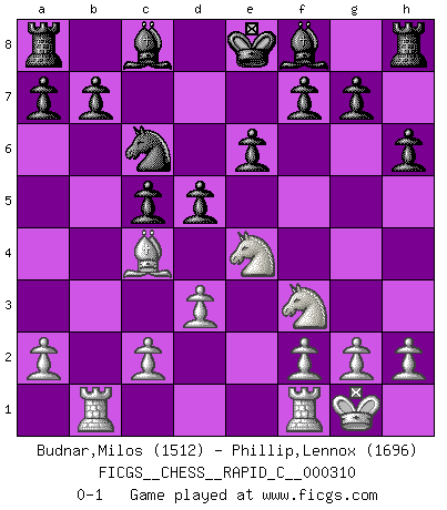 Last move : 0-1 2025 May 1 14:19:3 [Event "FICGS__CHESS__RAPID_C__000310"] [Site "FICGS"] [Date "2025.04.26"] [Round "1"] [White "Budnar,Milos"] [Black "Phillip,Lennox"] [Result "0-1"] [WhiteElo "1512"] [BlackElo "1696"] 1.e4 c5 2.Bc4 e6 3.Nf3 Nf6 4.O-O Nxe4 5.d3 Nf6 6.Bg5 h6 7.Bxf6 Qxf6 8.Nc3 Nc6 9.Ne4 Qxb2 10.Qb1 Qxb1 11.Raxb1 d5 0-1 Follow this game move after move (download)It is the aim of the modern school, not to treat every position according to one general law, but according to the principle inherent in the position. (Richard Reti) Im Leben werden Partien nie so unstrittig gewonnen wie im Spiel (Emanuel Lasker) A través de las casillas del tablero, los Indios explican el movimiento del tiempo y la edad, las influencias mas altas que controlan el mundo y los lazos que vinculan al Ajedrez con el alma humana. (Al-Masudi) Des idées, des idées, j'en ai cent, j'en ai mille. Des bonnes, des mauvaises, applicables, irréalisables... Il suffit de faire le tri ! (Roos) Either move or be moved. (Ezra Pound)