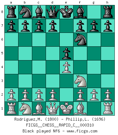 Last move : 1/2-1/2 2025 May 31 22:44:6 [Event "FICGS__CHESS__RAPID_C__000310"] [Site "FICGS"] [Date "2025.04.26"] [Round "1"] [White "Rodriguez,Mariano"] [Black "Phillip,Lennox"] [Result "1/2-1/2"] [WhiteElo "1800"] [BlackElo "1696"] 1.e4 e5 2.Nf3 Nf6 3.Nxe5 d6 4.Nf3 Nxe4 5.d4 d5 6.Bd3 Bd6 7.O-O O-O 8.c4 c6 9.Re1 Bf5 10.Qb3 Qd7 11.Nc3 Nxc3 12.Bxf5 Qxf5 13.bxc3 b6 14.cxd5 cxd5 15.Ba3 Bxa3 16.Qxa3 Nc6 17.h4 h6 18.Re2 Na5 19.Rae1 Nc4 20.Qb3 Rac8 21.Re7 a6 22.Ne5 b5 23.Nd7 Rfd8 24.Ne5 Rf8 25.g3 Nb6 26.Kg2 f6 27.Nf3 Nc4 28.Qb4 Kh8 29.Ng1 Nd2 30.c4 Nxc4 31.Ne2 g5 32.h5 a5 33.Qxb5 Nd2 34.Re3 Nc4 35.Re7 Nd2 36.Ng1 g4 37.R1e3 Rb8 38.Qd7 Qxd7 39.Rxd7 Rfd8 40.Rxd8+ Rxd8 41.f3 f5 42.Re6 Kh7 43.Re7+ Kg8 44.Re6 1/2-1/2 Follow this game move after move (download)First-class players lose to second-class players because second-class players sometimes play a first-class game. (Siegbert Tarrasch) Schach ist ein schwarz-weisser Dschungel. (Garry Kasparov) Cuando me preguntan: -¿Cual es el secreto que te hace hacer mejores movidas que tus oponentes?, Yo respondo: Me da gusto que me pregunten eso, porque, como veran, hay una simple razón. Yo pienso mis propias movidas y dejo a mi oponente que el piense las suyas. (Alexander Alekhine) Les sacrifices démontrent seulement que quelqu'un a gaffé. (Savielly Tartacover) Those who make the worst use of their time are the first to complain of its brevity. (Jean de la Bruyere)
