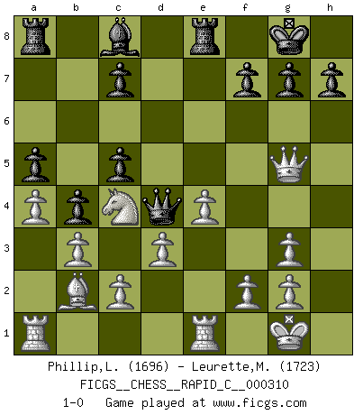 Last move : 1-0 2025 May 5 17:46:8 [Event "FICGS__CHESS__RAPID_C__000310"] [Site "FICGS"] [Date "2025.04.26"] [Round "1"] [White "Phillip,Lennox"] [Black "Leurette,Marc-Antoine"] [Result "1-0"] [WhiteElo "1696"] [BlackElo "1723"] 1.e4 e5 2.Nf3 Nc6 3.Bb5 a6 4.Ba4 Nf6 5.O-O Be7 6.Re1 O-O 7.Bxc6 dxc6 8.Nxe5 Nd7 9.Nf3 Re8 10.Nc3 b5 11.d3 Bb7 12.a4 b4 13.Ne2 a5 14.Ng3 c5 15.b3 Nf6 16.Nd2 Bd6 17.Nc4 Bxg3 18.hxg3 Ng4 19.Qxg4 Bc8 20.Qg5 Qd4 21.Bb2 1-0 Follow this game move after move (download)In order to improve your game, you must study the endgame before everything else, for whereas the endings can be studied and mastered by themselves, the middle game and the opening must be studied in relation to the endgame. (Jose Raul Capablanca) Zeige mir drei Eröffnungsvarianten und ich beweise dir, dass zwei davon inkorrekt sind. (Emanuel Lasker) Después de una mala apertura, hay una esperanza en el juego medio. Pero una vez que estas en finales, el momento de la verdad ha llegado. (Edmar Mednis) Je ne crois pas en la psychologie, je crois aux bons coups. (Robert Fischer) Any activity becomes creative when the doer cares about doing it right or doing it better. (John Updike)