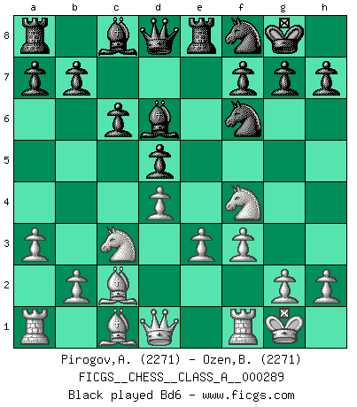 Last move : 1/2-1/2 2025 July 31 12:53:50 [Event "FICGS__CHESS__CLASS_A__000289"] [Site "FICGS"] [Date "2025.04.26"] [Round "1"] [White "Pirogov,Andrey Mikhaylovich"] [Black "Ozen,Bahadir"] [Result "1/2-1/2"] [WhiteElo "2271"] [BlackElo "2271"] 1.d4 Nf6 2.c4 e6 3.Nc3 Bb4 4.e3 O-O 5.Nge2 d5 6.a3 Be7 7.cxd5 exd5 8.Nf4 c6 9.Bd3 Re8 10.O-O Nbd7 11.f3 Nf8 12.Bc2 Bd6 13.e4 dxe4 14.fxe4 Bg4 15.Qd3 c5 16.h3 cxd4 17.Qxd4 Rc8 18.Qf2 Bf5 19.Nfe2 Be6 20.Bf4 Bc5 1/2-1/2 Follow this game move after move (download)Chess makes man wiser and clear-sighted. (Vladimir Putin) Um dein Spiel zu verbessern musst du zuallererst das Endspiel studieren, denn diese kann unabhängig studiert werden. Die Eröffnung und das Mittelspiel müssen immer in Bezug gesetzt werden zum Endspiel. (José Raúl Capablanca) Yo no le temo a Spassky. Todos saben que yo soy el mejor. Uno no necesita un torneo para probarlo. (Bobby Fischer) Un millionnaire : 'Monsieur Steinitz ! Vous ne participez aux tournois que pour l'argent, alors que moi je n'y viens que pour l'honneur.' Steinitz : 'Chacun joue pour ce qu'il n'a pas'... Everything in life is luck. (Donald Trump)