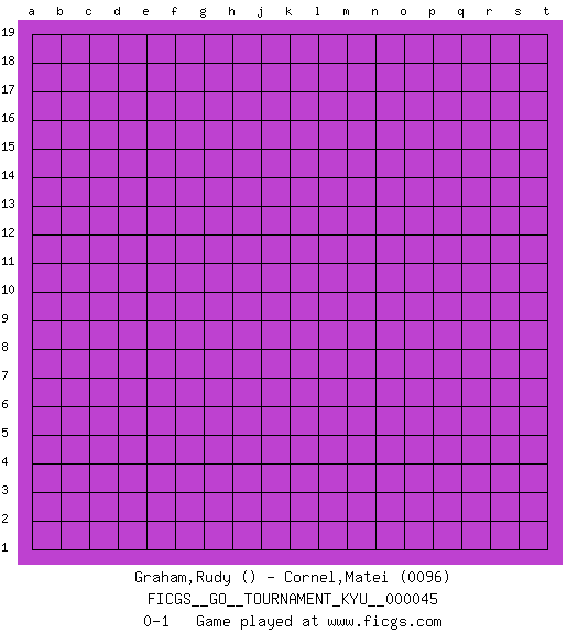 Last move : 0-1 2007 October 2 17:22:37 [Event "FICGS__GO__TOURNAMENT_KYU__000045"] [Site "FICGS"] [Date "2007.09.30"] [Round "1"] [Black "Graham,Rudy"] [White "Cornel,Matei"] [Result "0-1"] [Rating 2 "0096"] 0-1 Here are the names of the openings (joseki) played in the four corners : Player White won this Go (weiqi, baduk) game. Follow this game move after move (download)The nature of a game comes from what is played, but it's the sensitivity to the possible and the impossible that gives it value. (Pierre Audouard) Never was anything great achieved without danger. (Niccolo Machiavelli)