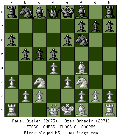 Last move : 0-1 2025 July 13 9:32:6 [Event "FICGS__CHESS__CLASS_A__000289"] [Site "FICGS"] [Date "2025.04.26"] [Round "1"] [White "Faust,Dieter"] [Black "Ozen,Bahadir"] [Result "0-1"] [WhiteElo "2075"] [BlackElo "2271"] 1.Nc3 d5 2.d4 Nf6 3.Bf4 e6 4.a3 c5 5.e3 a6 6.Nf3 b5 7.Be2 Bb7 8.O-O Nbd7 9.h3 c4 10.Ne5 Nxe5 11.Bxe5 Bd6 12.f4 O-O 13.Bxd6 Qxd6 14.Qe1 Bc6 15.g4 a5 16.Bf3 Rfb8 17.Ne2 b4 18.g5 Ne8 19.axb4 Rxb4 20.Ra2 Qb8 21.Qc3 a4 22.Qa3 Nd6 23.Ng3 Rb3 24.Qc5 Rb6 25.h4 Be8 26.e4 Qd8 27.e5 Nb5 28.Bg2 Rc8 29.Qb4 c3 30.Qxa4 R6b8 31.b4 Ra8 32.Qb3 Nxd4 0-1 Follow this game move after move (download)In the perfect Chess combination as in a first-rate short story, the whole plot and counter-plot should lead up to a striking finale, the interest not being allayed until the very last moment. (Yates and Winter) Es ist nicht das erste mal, dass sich die FIDE dem Arabischen Geld gebeugt hat (über die FIDE WM 2004 in Lybien). (Larry Evans) No es tiempo de jugar al Ajedrez cuando la casa esta en llamas. (Proverbio Italiano) Nous vivons dans un monde échiquéen : chaque jour qui passe est un défi à relever. (Philosophe Sasha) The difference between perseverance and obstinacy is that one comes from a strong will, and the other from a strong won't. (Henry Ward Beecher)