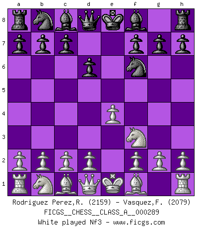 Last move : 1-0 2025 August 9 16:50:56 [Event "FICGS__CHESS__CLASS_A__000289"] [Site "FICGS"] [Date "2025.04.26"] [Round "1"] [White "Rodriguez Perez,Rene"] [Black "Vasquez,Fernando"] [Result "1-0"] [WhiteElo "2159"] [BlackElo "2079"] 1.e4 e5 2.Nf3 Nf6 3.Nxe5 d6 4.Nf3 Nxe4 5.d4 Be7 6.Bd3 d5 7.O-O Nc6 8.c4 Nb4 9.Be2 O-O 10.Nc3 Bf5 11.a3 Nxc3 12.bxc3 Nc6 13.cxd5 Qxd5 14.Re1 Rfe8 15.Bf4 Rac8 16.Bd3 Qd7 17.Rb1 b6 18.d5 Bxd3 19.Qxd3 1-0 This chess game has been lost on time (started : 2025.04.26 11:22:2) Follow this game move after move (download)If one piece is badly posted, the whole game is bad. (Tarrasch) Vielleicht wirkt die Aura früherer Spieler glanzvoller als die der heutigen Spieler, aber das liegt daran, dass man kein Programm wie Fritz hatte, das einem all die Löcher in ihren Partien zeigt. (Vladimir Kramnik) El Ajedrez es despiadado: debes de estar preparado para matar gente. (Nigel Short) 'L'échange des dames est un coup dur pour les deux adversaires...' Un journaliste lors d'une partie du match Spassky-Fischer Now you put water in a cup, it becomes the cup; You put water into a bottle it becomes the bottle; You put it in a teapot it becomes the teapot. Water can flow or it can crash. Be water, my friend. (Bruce Lee)