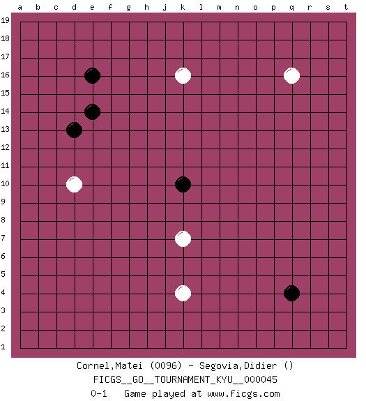 Last move : 0-1 2007 October 9 7:41:49 [Event "FICGS__GO__TOURNAMENT_KYU__000045"] [Site "FICGS"] [Date "2007.09.30"] [Round "1"] [Black "Cornel,Matei"] [White "Segovia,Didier"] [Result "0-1"] [Rating 1 "0096"] 1.k10 q16 2.q4 k16 3.e16 d10 4.e14 k4 5.d13 k7 0-1 Here are the names of the openings (joseki) played in the four corners : Player White won this Go (weiqi, baduk) game. Follow this game move after move (download)... {it is} something unearthly... if there are sentient beings on other planets, then they play go. (Emanuel Lasker, chess world champion) Is not life a hundred times too short to bore ourselves ? (Friedrich Nietzsche)
