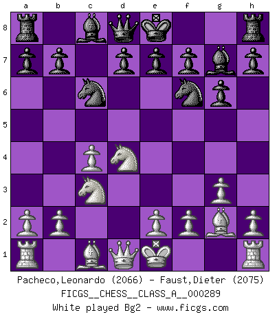 Last move : 0-1 2025 October 28 15:28:38 [Event "FICGS__CHESS__CLASS_A__000289"] [Site "FICGS"] [Date "2025.04.26"] [Round "1"] [White "Pacheco,Leonardo"] [Black "Faust,Dieter"] [Result "0-1"] [WhiteElo "2066"] [BlackElo "2075"] 1.c4 c5 2.Nf3 Nf6 3.Nc3 Nc6 4.g3 g6 5.d4 cxd4 6.Nxd4 Bg7 7.Bg2 O-O 8.O-O Nxd4 9.Qxd4 d6 10.Qd3 a6 11.Bg5 h6 12.Be3 Bd7 13.Qd2 Ng4 14.Bd4 Bc6 15.Nd5 Bxd5 16.cxd5 Bxd4 17.Qxd4 Nf6 18.Bh3 Kh7 19.Rfc1 Nd7 20.Rc3 Rc8 21.Rac1 Rxc3 22.Qxc3 Nf6 23.Qc8 Qxc8 24.Bxc8 a5 25.Bxb7 Rb8 26.Rc7 Kg7 27.Rxe7 Kf8 28.Rc7 Ne8 29.Rd7 Nf6 30.Rxd6 Ne4 31.Rb6 Nc5 32.Rb5 Nxb7 33.e4 Ke7 34.e5 Kd7 35.f4 Kc7 36.Kf2 f6 37.Ke3 fxe5 38.fxe5 Rf8 39.Rb3 Rf5 40.Kd4 Rf2 41.d6+ Kc6 42.Rc3+ Kb6 43.Kd5 Nd8 44.Rb3+ Ka7 45.h4 Rd2+ 46.Kc4 Rc2+ 47.Kd4 Rd2+ 48.Ke3 Rd5 49.Ke4 Rd2 50.Rb5 Ka6 51.a4 Re2+ 52.Kd5 Rd2+ 53.Kc4 Rd1 54.b4 Rc1+ 55.Kd3 axb4 56.Rxb4 Rd1+ 57.Kc4 Nc6 58.Rb5 Nd8 59.Rb3 Rc1+ 60.Kd4 Rd1+ 61.Rd3 Re1 62.Kd5 Nf7 63.d7 Rxe5+ 64.Kc6 Re1 0-1 Follow this game move after move (download)One of these modest little moves may be more embarrassing to your opponent than the biggest threat. (Siegbert Tarrasch) Kein Großmeister ist normal. Sie unterscheiden sich nur im Ausmaß Ihrer Verrücktheit. (Viktor Kortschnoi) No volvere nunca a jugar contigo. Has insultado a mi amigo. - cuando un oponente se maldijo por una mala jugada (Miguel Najdorf) À la honte des hommes, on sait que les lois du jeu sont les seules qui soient partout justes, claires, inviolables et exécutées. Pourquoi l'Indien qui a donné les règles du jeu d'échecs est-il obéi de bon gré dans toute la terre, et que les décrétales des papes, par exemple, sont aujourd'hui un objet d'horreur et de mépris ? C'est que l'inventeur des échecs combina tout avec justesse pour la satisfaction des joueurs, et que les papes, dans leurs décrétales, n'eurent en vue que leur seul avantage. L'Indien voulut exercer également l'esprit des hommes et leur donner du plaisir; les papes ont voulu abrutir l'esprit des hommes. Voltaire (Dictionnaire philosophique / Garnier 1967) God is an atheist. (Unknown)