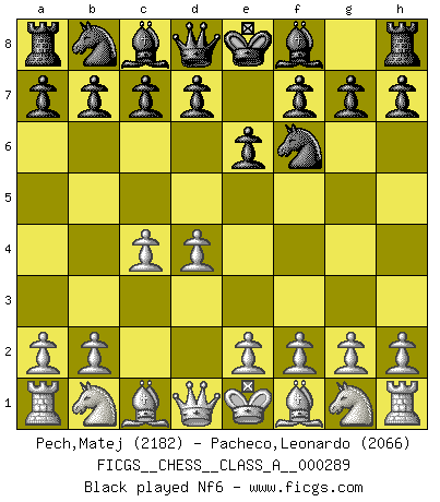 Last move : 0-1 2025 June 21 21:48:35 [Event "FICGS__CHESS__CLASS_A__000289"] [Site "FICGS"] [Date "2025.04.26"] [Round "1"] [White "Pech,Matej"] [Black "Pacheco,Leonardo"] [Result "0-1"] [WhiteElo "2182"] [BlackElo "2066"] 1.c4 e6 2.d4 Nf6 3.Nc3 Bb4 4.e3 O-O 5.Bd3 d5 0-1 This chess game has been lost on time (started : 2025.04.26 11:22:2) Follow this game move after move (download)Though most people love to look at the games of the great attacking masters, some of the most successful players in history have been the quiet positional players. They slowly grind you down by taking away your space, tying up your pieces, and leaving you with virtually nothing to do ! (Yasser Seirawan) Kein Schachspieler kann gut schlafen. (H. G. Wells) Prefiero perder una partida realmente buena, que ganar una mala. (David Levy) Votre prénom est 'Tactique', votre deuxième prénom est 'Tactique' et votre nom est 'Tactique'. (Ken Smith) The message for business people contemplating their place in the cyberspace is simple and direct: get linked or get lost. (Vic Sussman and Kenan Pollack)