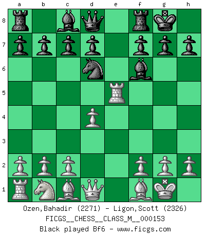 Last move : 1/2-1/2 2025 May 21 15:29:57 [Event "FICGS__CHESS__CLASS_M__000153"] [Site "FICGS"] [Date "2025.04.27"] [Round "1"] [White "Ozen,Bahadir"] [Black "Ligon,Scott"] [Result "1/2-1/2"] [WhiteElo "2271"] [BlackElo "2326"] 1.e4 e5 2.Nf3 Nc6 3.Bb5 Nf6 4.O-O Nxe4 5.Re1 Nd6 6.Nxe5 Be7 7.Bf1 Nxe5 8.Rxe5 O-O 9.d4 Bf6 10.Re1 Nf5 11.c3 d5 12.Nd2 c6 13.Nf3 Nd6 14.h3 Bf5 15.Bf4 a5 16.a4 Be4 17.Ne5 Re8 18.Qb3 Bg5 19.Bh2 h5 20.Re2 1/2-1/2 Follow this game move after move (download)The game of chess is the touchstone of the intellect. (Goethe) Nie in meinem Leben habe ich die französische Verteidigung gespielt, welche die Stumpfsinnigste von allen ist. (Wilhelm Steinitz) El Ajedrez es un juego terrible. Si no dominas el centro, tu oponente tiene una posición mas libre. Si tu tienes el centro, entonces realmente tienes algo de que preocuparte. (Siegbert Tarrasch) Avec des compensations pour le matériel en plus... (Anonyme) The intuitive mind is a sacred gift; the rational mind is a faithful servant. We have created a society that honors the servant but has forgotten the gift. (Albert Einstein)