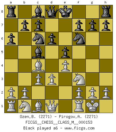 Last move : 1/2-1/2 2025 July 31 12:54:18 [Event "FICGS__CHESS__CLASS_M__000153"] [Site "FICGS"] [Date "2025.04.27"] [Round "1"] [White "Ozen,Bahadir"] [Black "Pirogov,Andrey Mikhaylovich"] [Result "1/2-1/2"] [WhiteElo "2271"] [BlackElo "2271"] 1.e4 e5 2.Nf3 Nc6 3.Bc4 Nf6 4.d3 Bc5 5.c3 d6 6.O-O a6 7.a4 h6 8.Re1 O-O 9.h3 Ba7 10.Nbd2 Be6 11.Bxe6 fxe6 12.b4 Ne7 13.d4 exd4 14.cxd4 Qd7 15.Nf1 d5 16.Ng3 dxe4 17.Nxe4 Nc6 18.Nc5 Bxc5 19.bxc5 Rad8 20.Ra2 e5 21.Nxe5 1/2-1/2 Follow this game move after move (download)There must have been a time when men were demigods, or they could not have invented Chess. (Gustav Schenk) Wer der Ansicht ist, daß alle Schachspieler verrückt sind, wird durch Studium des Lebens von Emil Josef Diemer nicht auf andere Gedanken kommen. (Hans Ree) El Ajedrez, como cualquier actividad creativa, solo puede existir a través del esfuerzo combinado de aquellos que tienen talento creativo y de aquellos que poseen la habilidad de organizar su trabajo creativo. (Mikhail Botvinnik) Vous m'avez demandé de vous exposer quel est le fondement de la prière. Je ne fais que préparer les pièces du jeu sur la table... Nous sera-t-il permis d'en adopter les règles et si nous les appliquons scrupuleusement nous ne tarderons pas à faire mat le Roi divin ! Il ne pourra échapper à nos mains. (Sainte Thérèse d'Avila, Chemin de perfection) To steal ideas from one person is plagiarism. To steal from many is research. (Unknown)